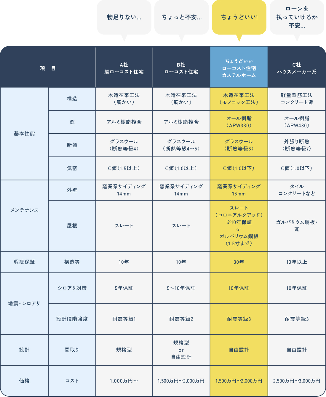 カステルホームでは、基本性能と標準装備される仕様をHP上で公開するようにしています。