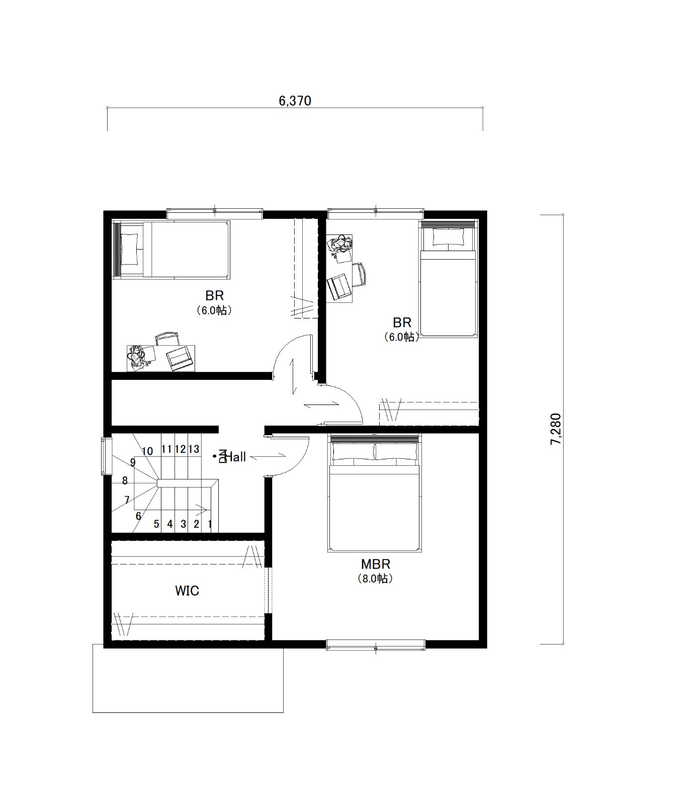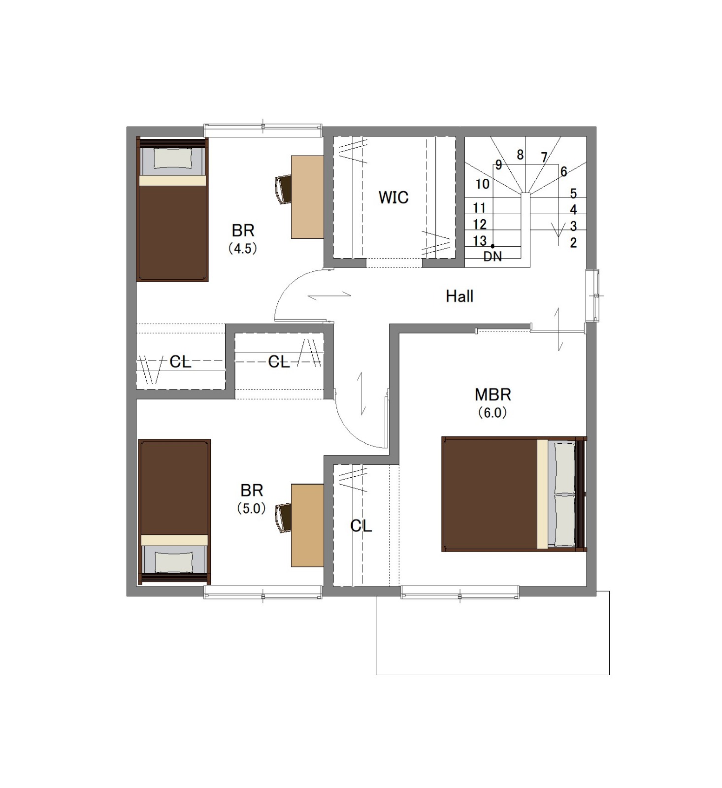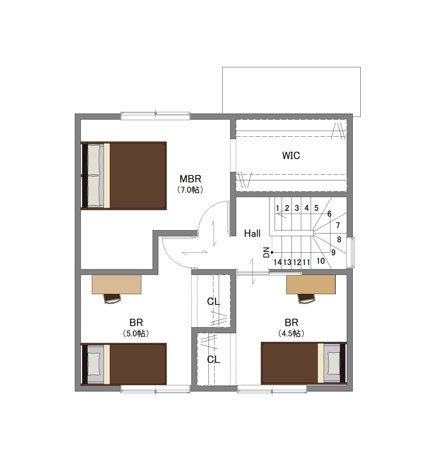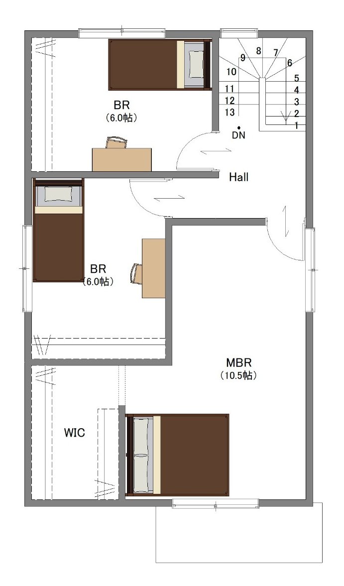 2階はゆとりある10.5帖の主寝室に加え、しっかり収納付きの個室が2部屋。