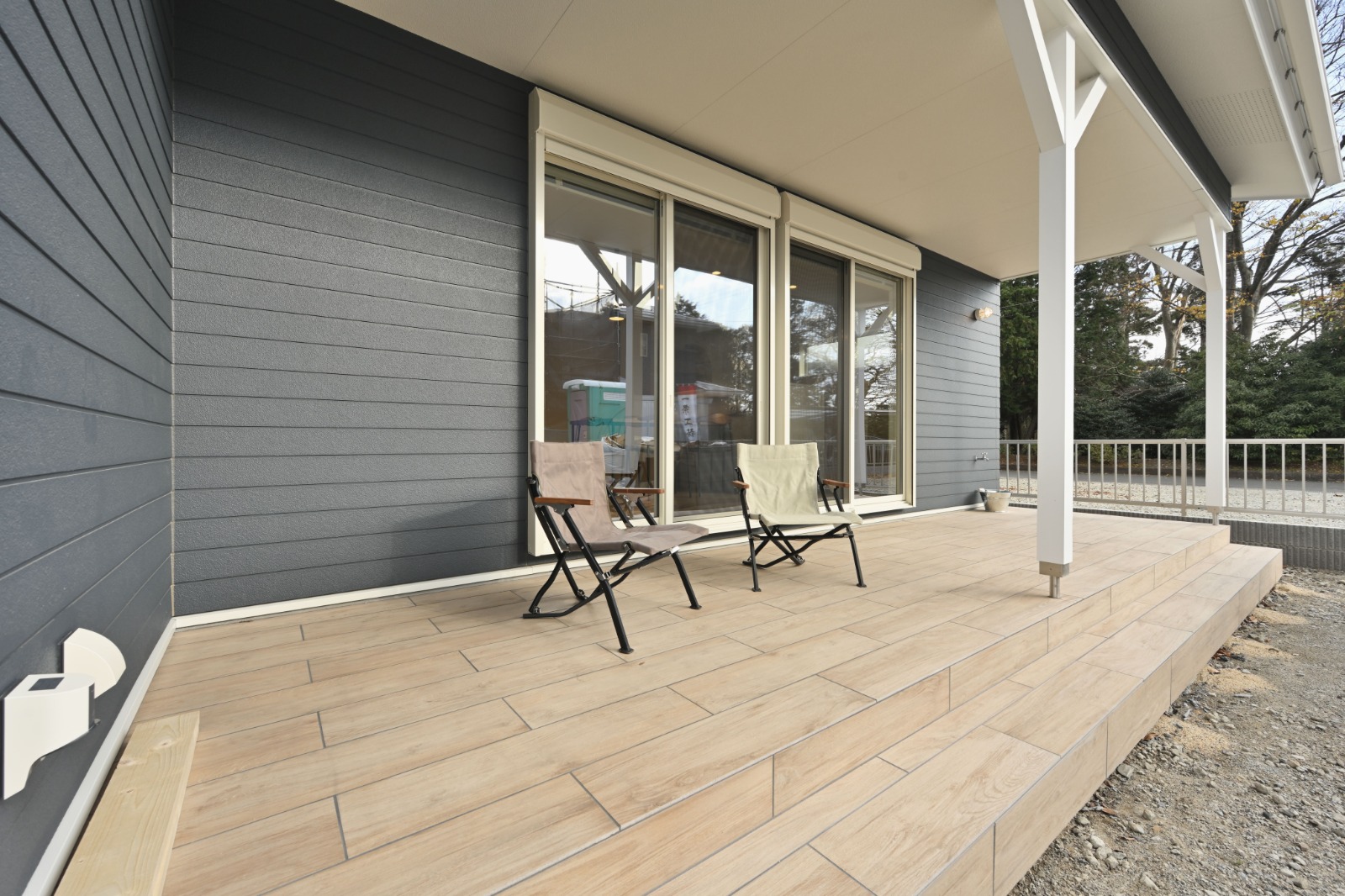 A.オープンテラスとリビングからテラスに出るガラス窓。テラスでは季節に合わせた過ごし方ができる。大きな窓があるおかげで日中リビングがすごく明るくある。