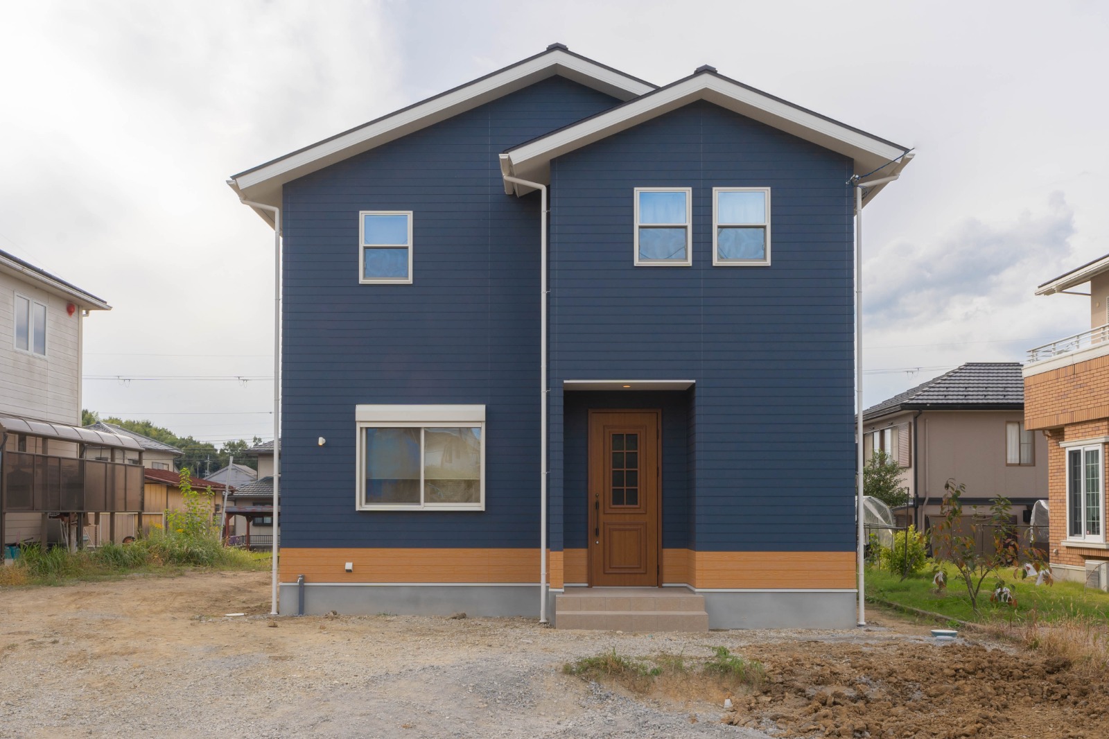 ネイビーブルーの外壁にアクセントカラーのイエローを組み合わせた個性的な外観デザイン。