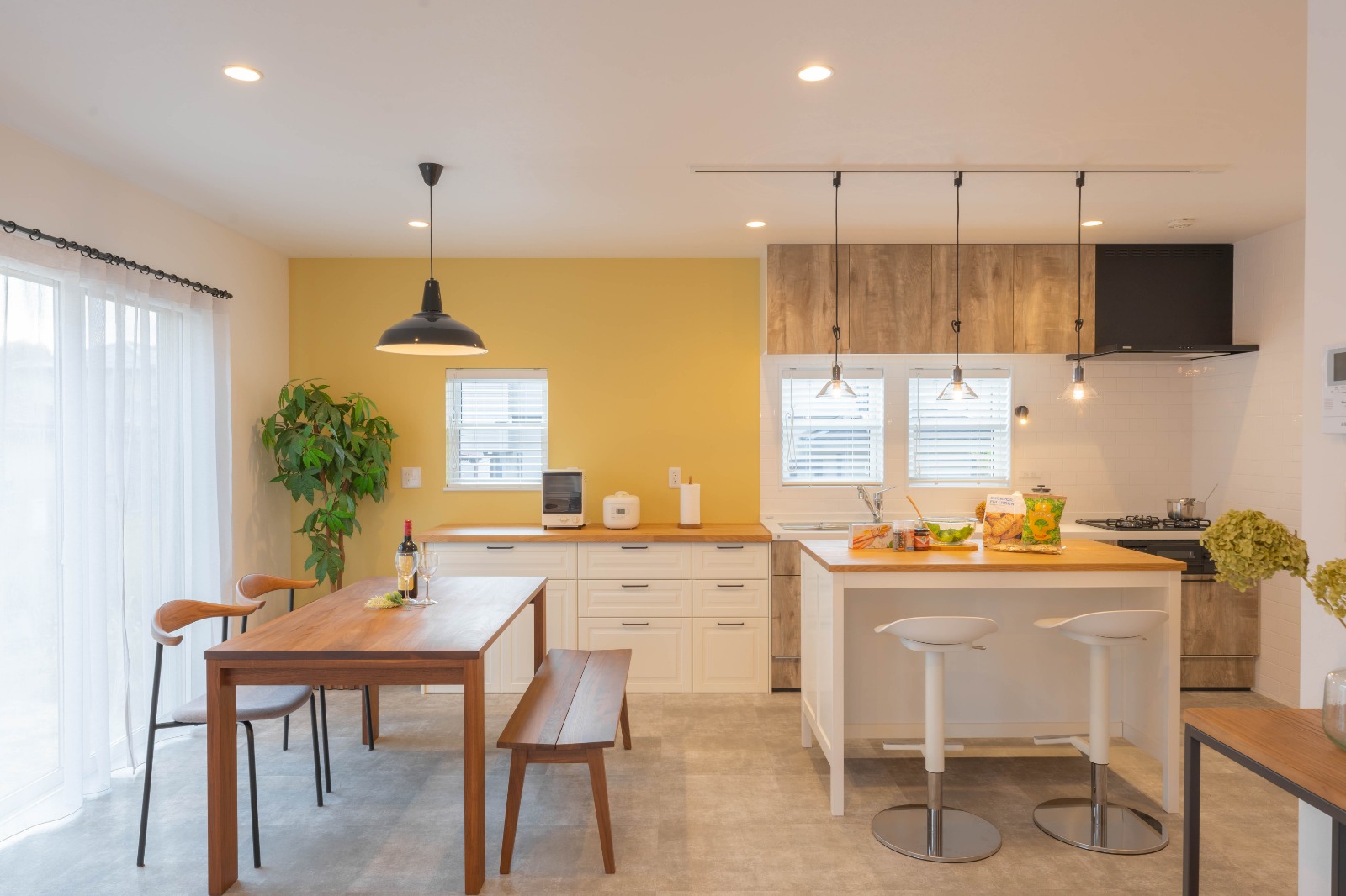 パウダーイエローが元気をくれるようなダイニングキッチン。