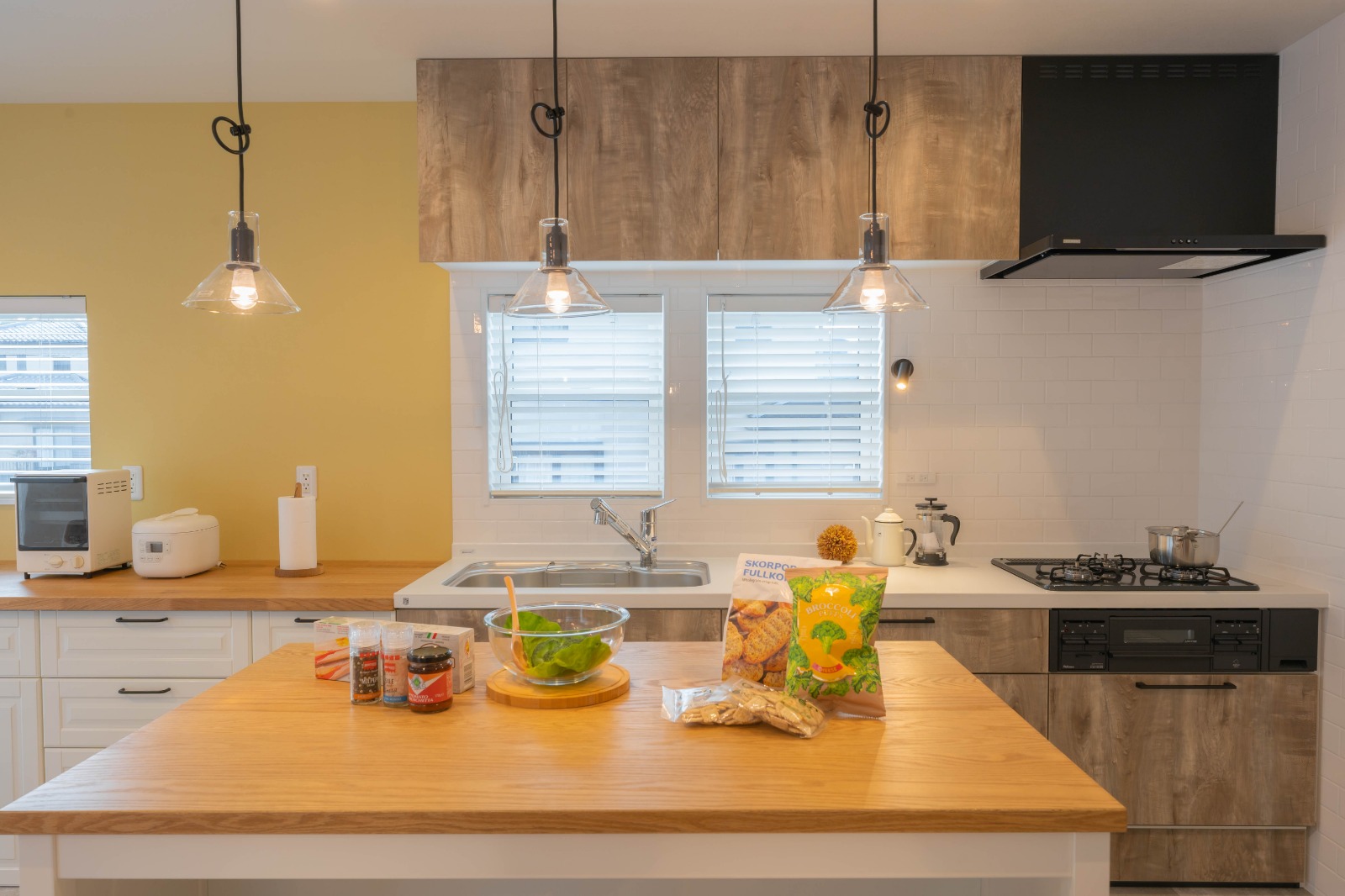 アンティーク風の木調が引き立つキッチン。背面は白いタイル張りでおしゃれに演出。