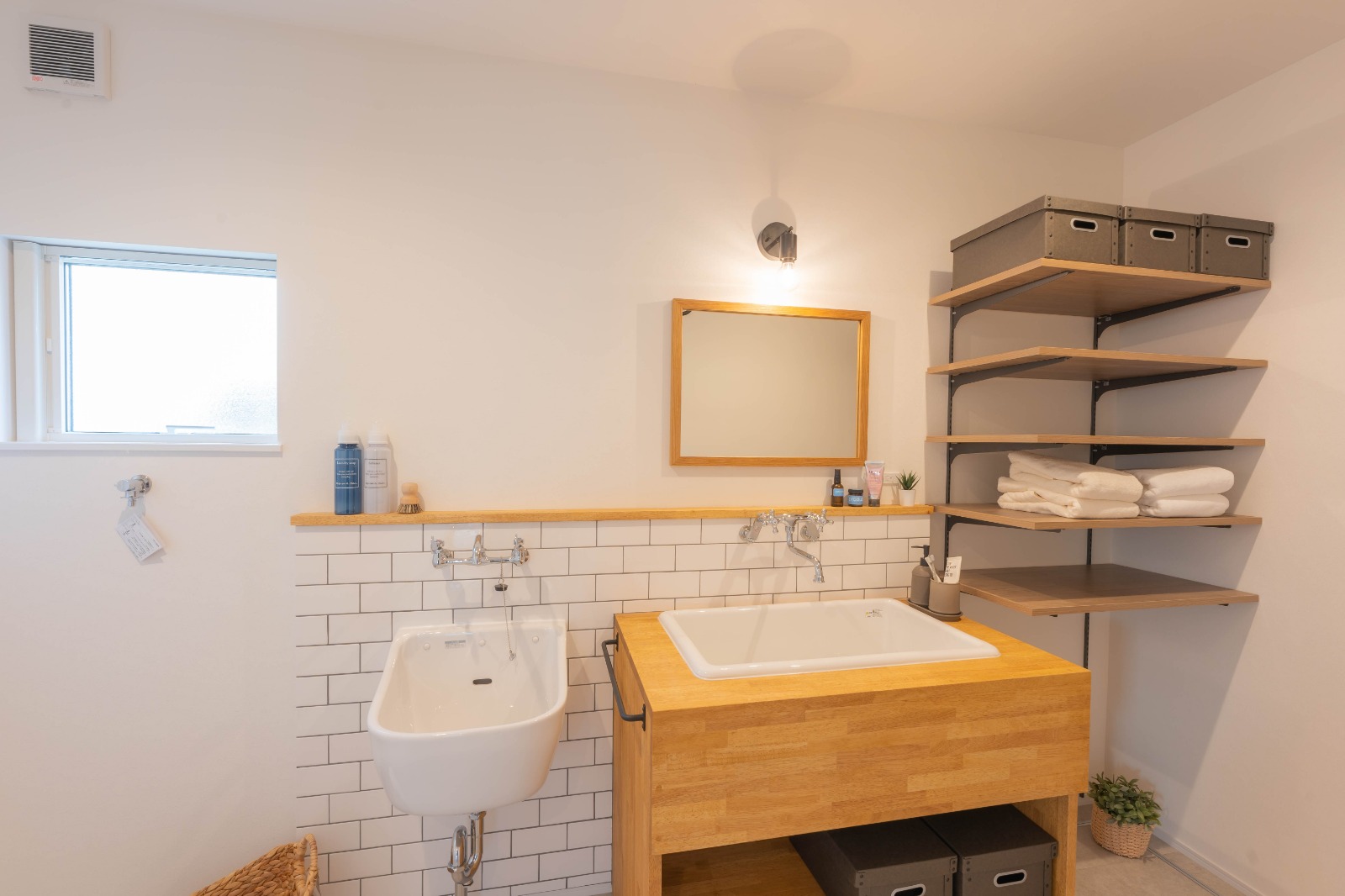 タイルやアイアン調の物干しも設置し、おしゃれで便利な洗面空間に。
