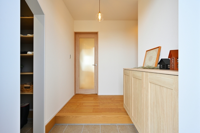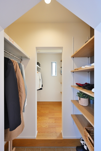 玄関からシューズクローク→ファミリークローゼット→和室→リビングに繫がっていて、花粉やpm2.5をリビングに取り込まずに上着を収納できます。