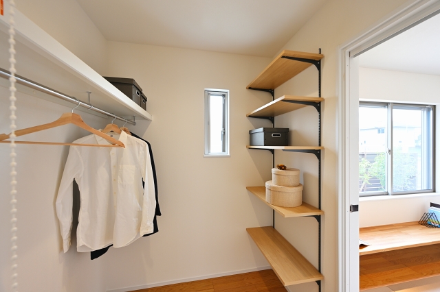 1階にファミリークローゼットを設けました。和室からもつながり、玄関横のシューズクロークにもつながることで、帰宅時にさっと玄関からカバンを置けるのも嬉しいポイントです。