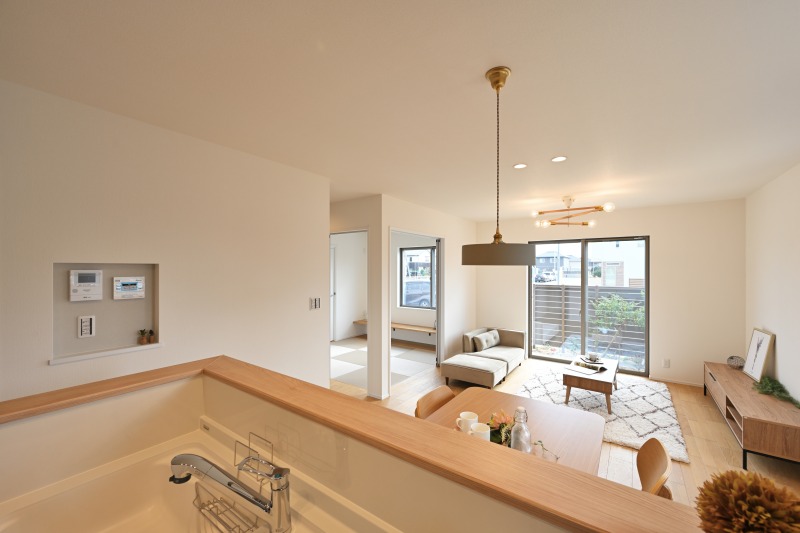和室建具を開放すれば、キッチンからはリビングや和室まで見渡せ、小さなお子様にも目が届きやすい工夫をしています。