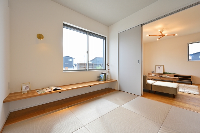 リビングとつながる和室。普段はリビングの一部として、来客時などは建具で仕切って個室として。造作カウンターはスタディコーナーとしてや、ディスプレイしたりと多目的に使用できます。