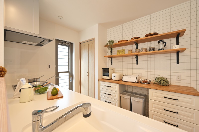 キッチンにはパントリーも設置。2段の造作カウンターも設置し、魅せる収納としておしゃれに使っていただけます。ナチュラルな雰囲気にも合うタイル調のアクセントクロスもポイントです。