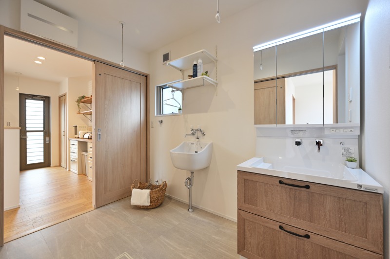 キッチンや玄関それぞれにつながる2WAYな洗面室。家事動線も良く、便利なマルチシンクや室内物干し、タオルや着替えなどの収納ケースなどを置けるスペースもしっかり確保し、充実の洗面室です。