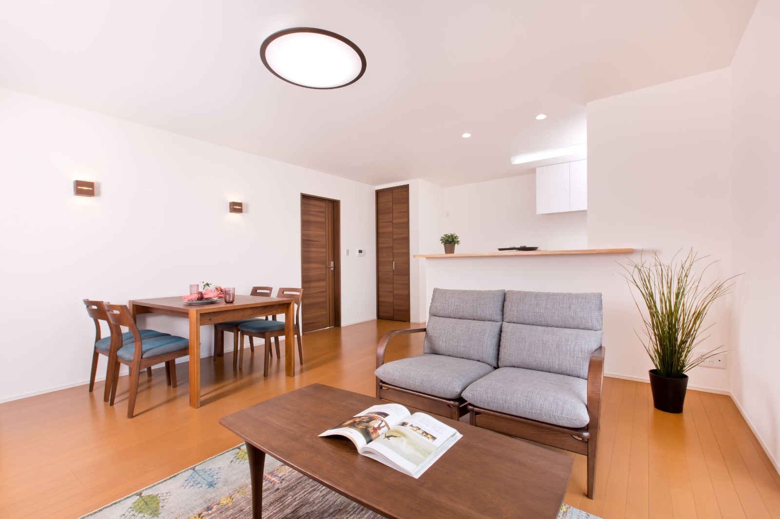 建てるなら、絶対に平屋と決めていたとAさん。空間を余すところなく、効率的に使うお住まいを叶えられました。壁面に取り付けたブラケットが生み出す間接照明で、夜はまた違った表情を見せてくれます。