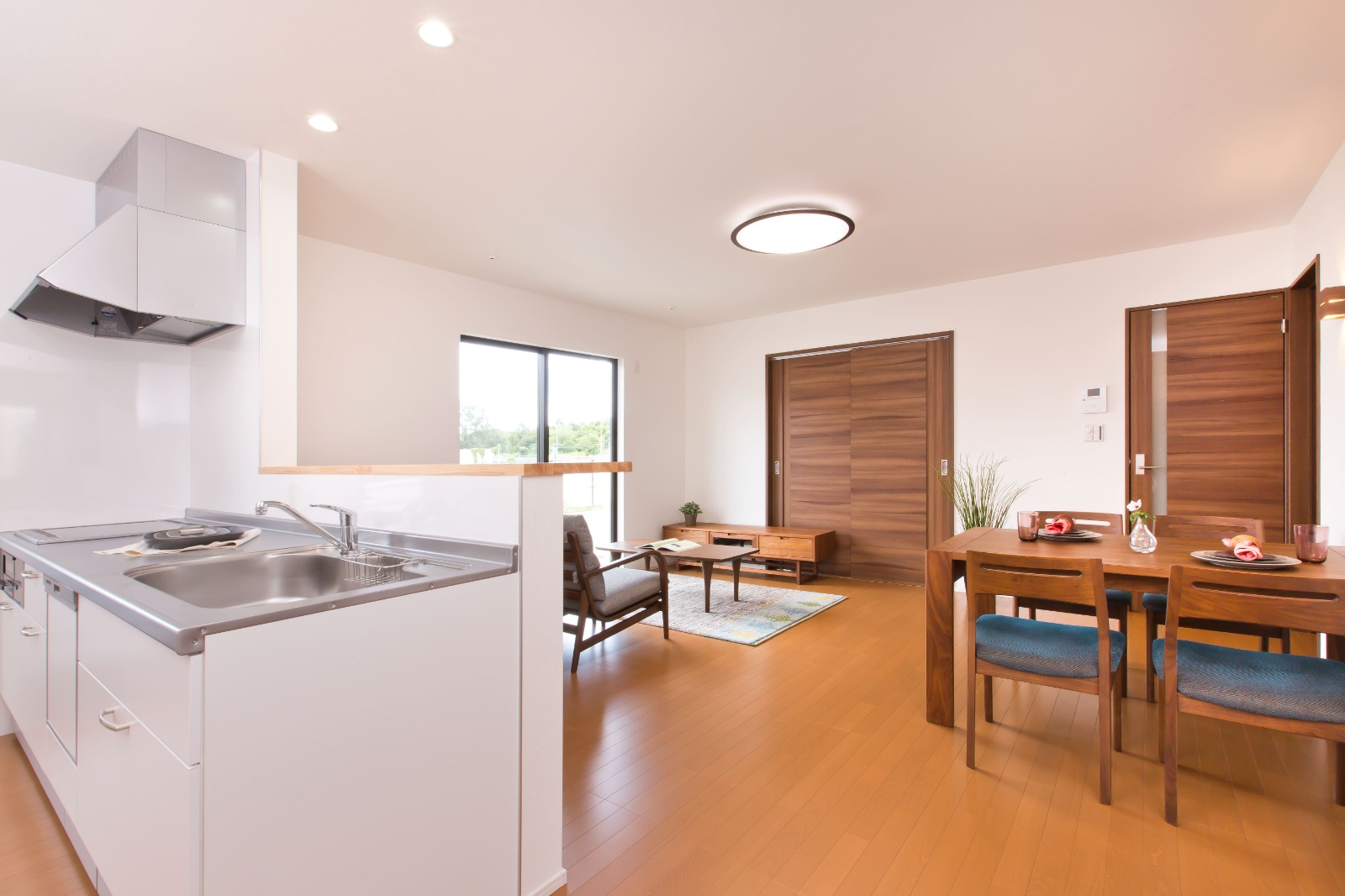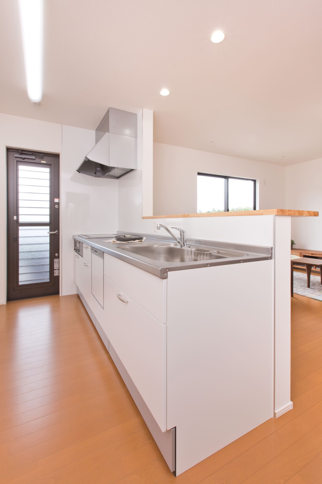 キッチンカウンターは造作。リビングから手元が見えない高さを確保。吊戸棚をなくして視界もすっきり◎