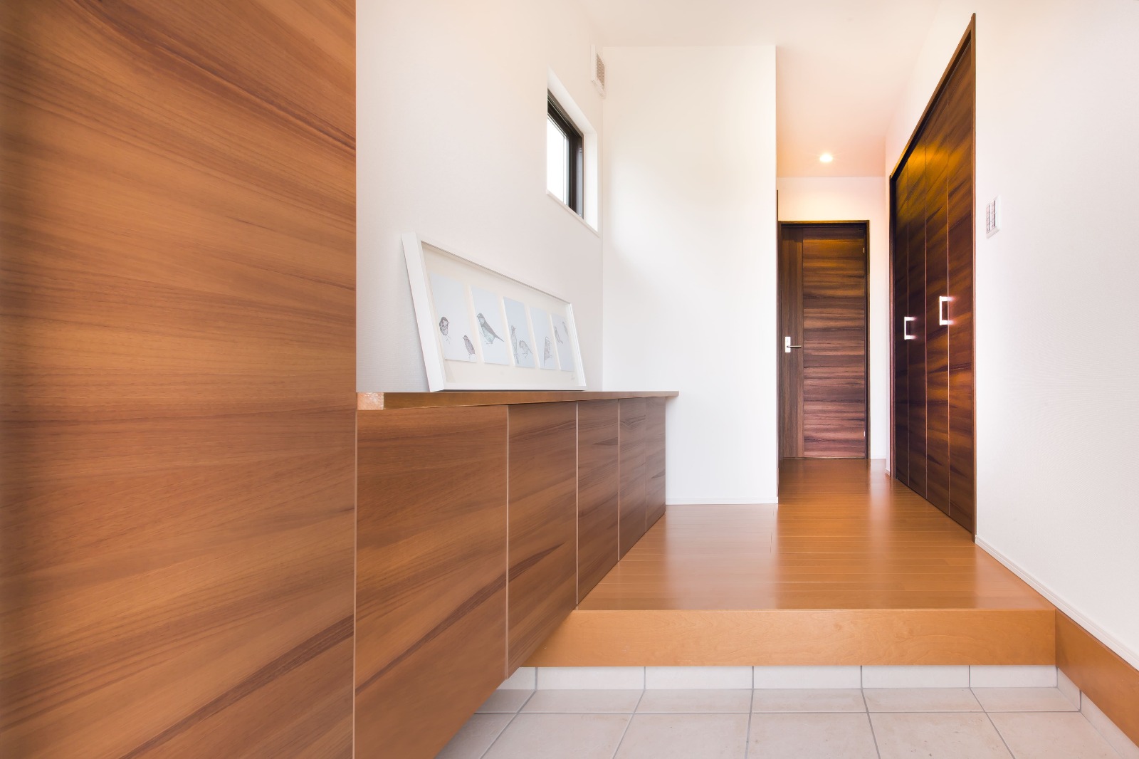 Low シューズクロークのある玄関ホール。傘立てを置きたくない!というのもAさんからのリクエストでした。視界を遮らず、実際以上の広さを感じます。