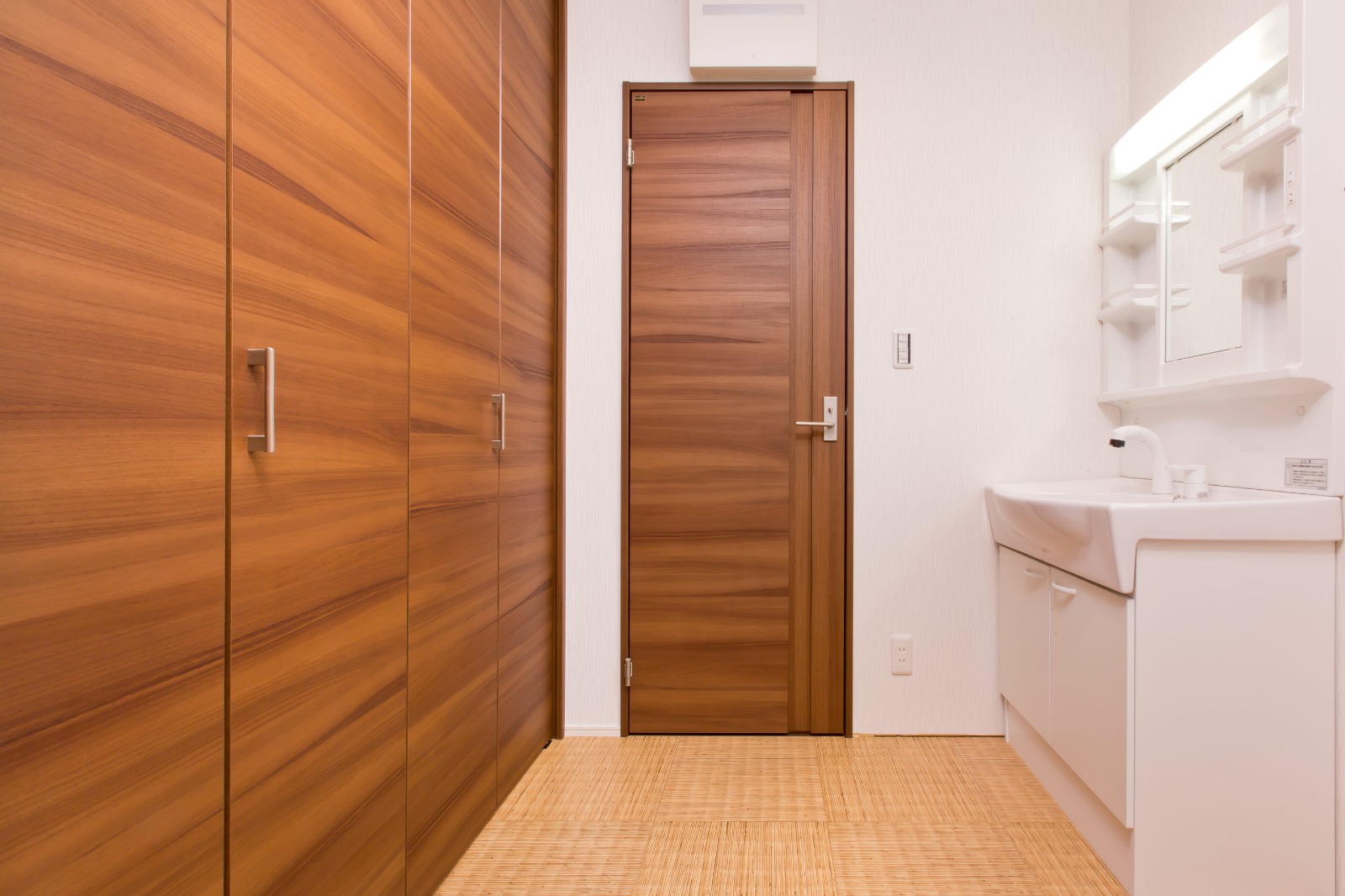 着替えやタオルもたっぷり収納できる洗面室。無駄な空間をとことん省いた使いやすい住まいに。