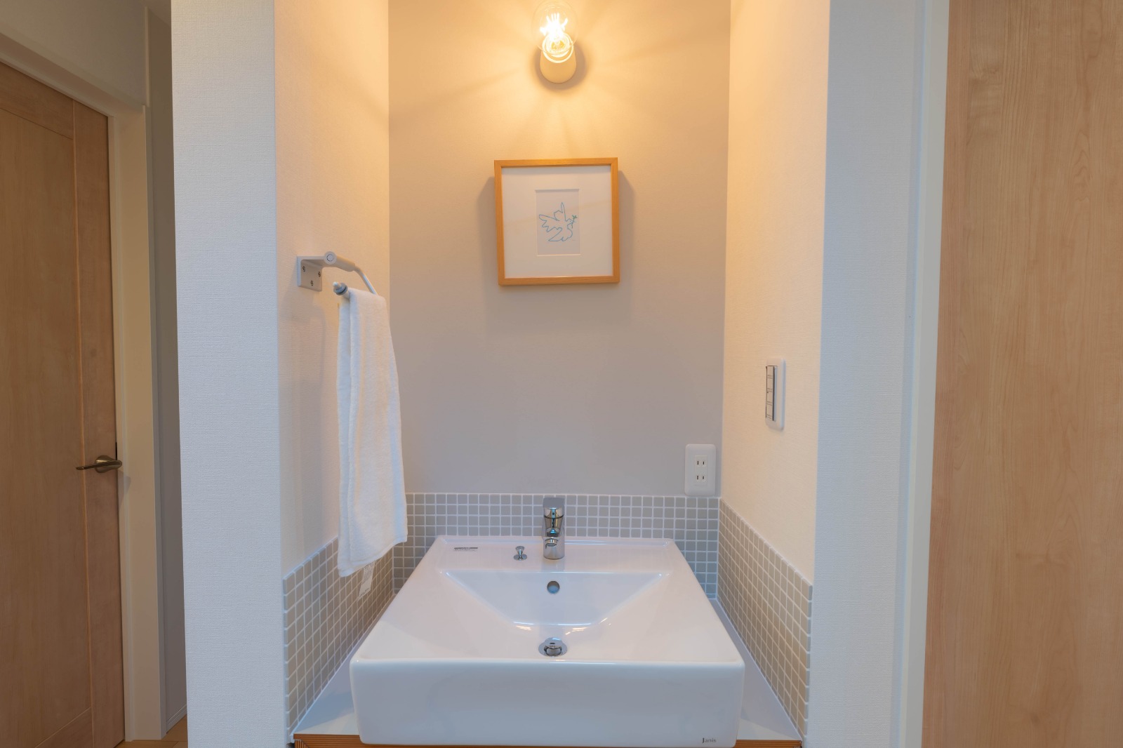 帰宅後すぐに手洗いうがいができるよう 廊下にコンパクト手洗い器を設置。