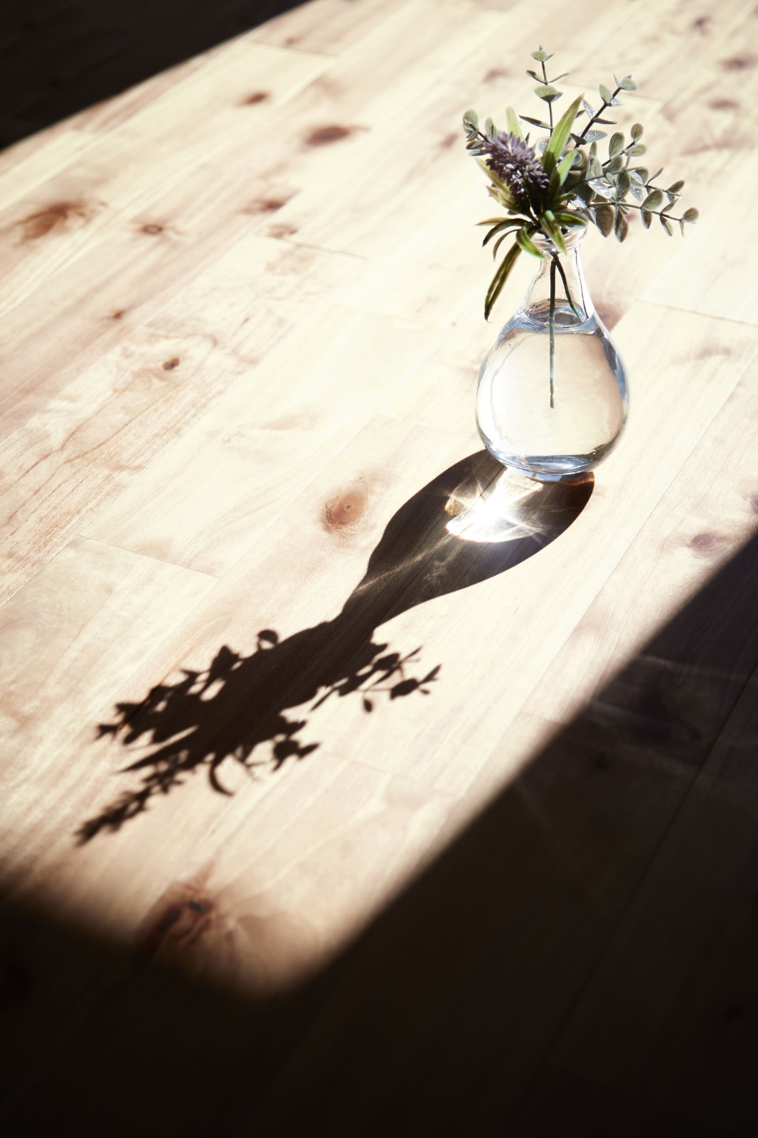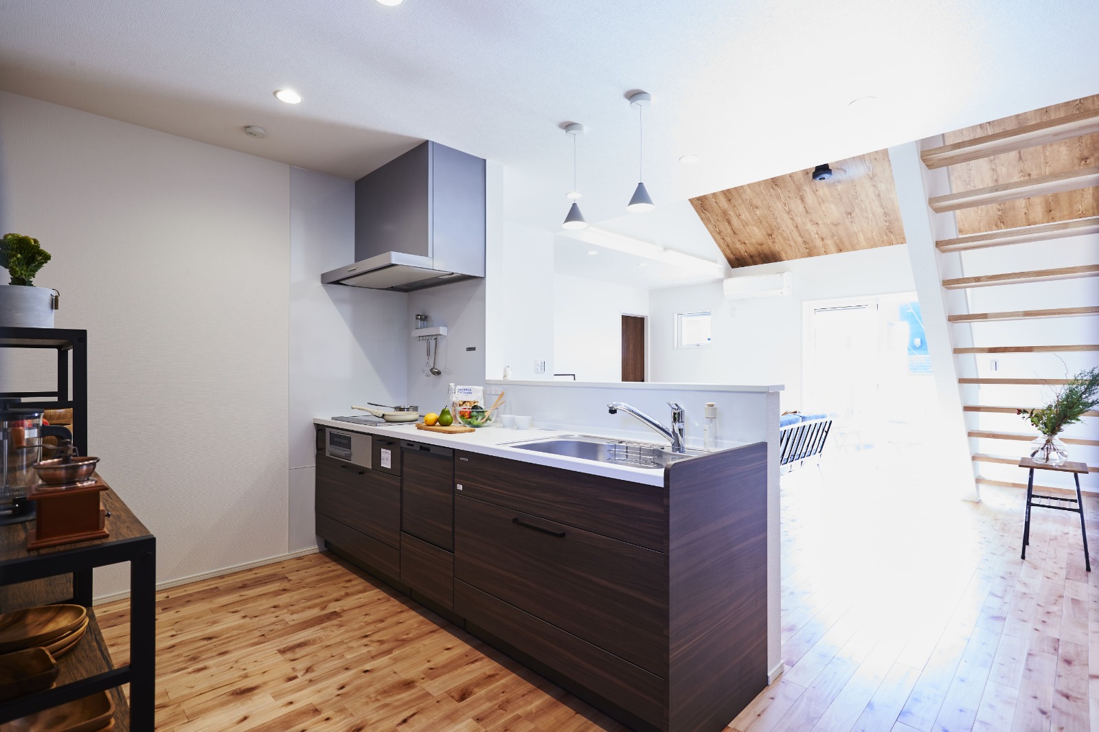 1階は無垢床のサクラ、2階は無垢床のパイン材を採用。どちらもあたたかみを感じられる空間に。