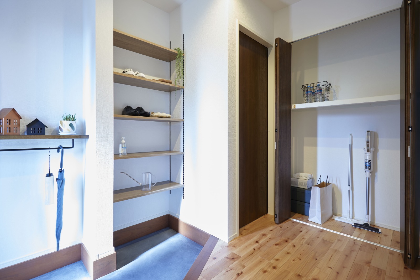 玄関には炭入りモルタルを採用。シューズクロークも可動棚になっていて好きな高さに変えられます。収納スペースには、Wi-Fiを収納できるようにされました。