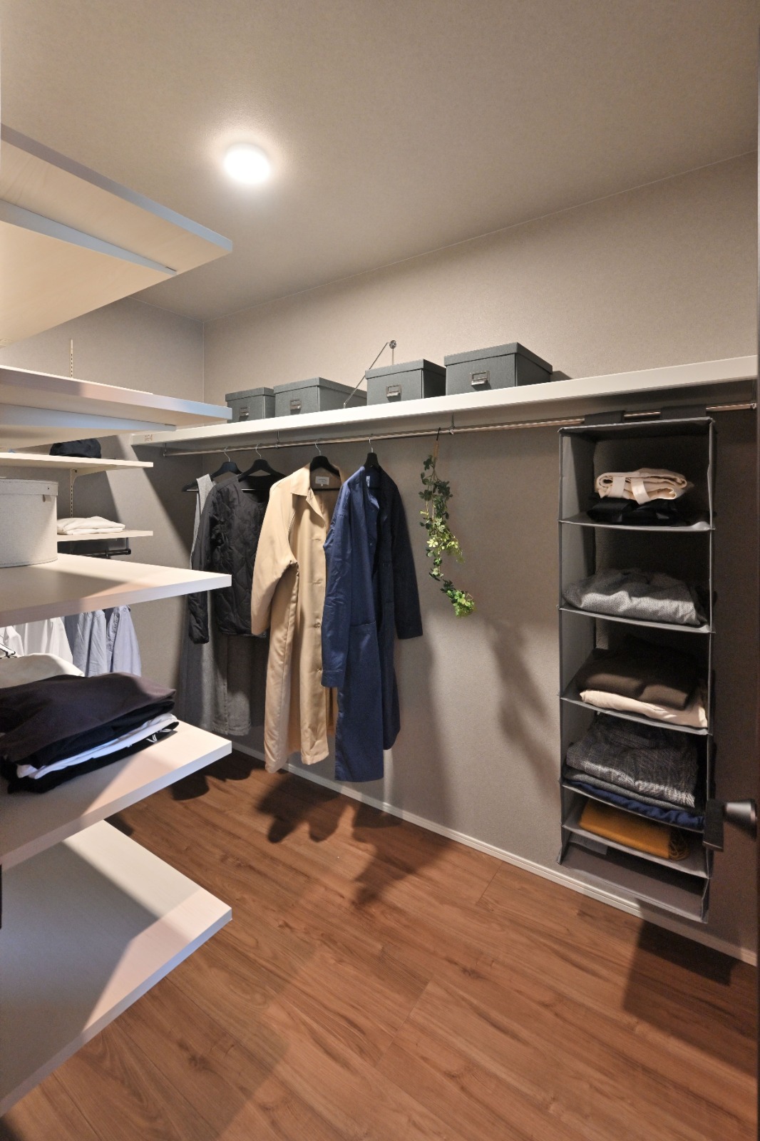 大容量のウォークインクローゼット。可動棚とハンガーパイプを上手く組み合わせて、多用途に収納できます。