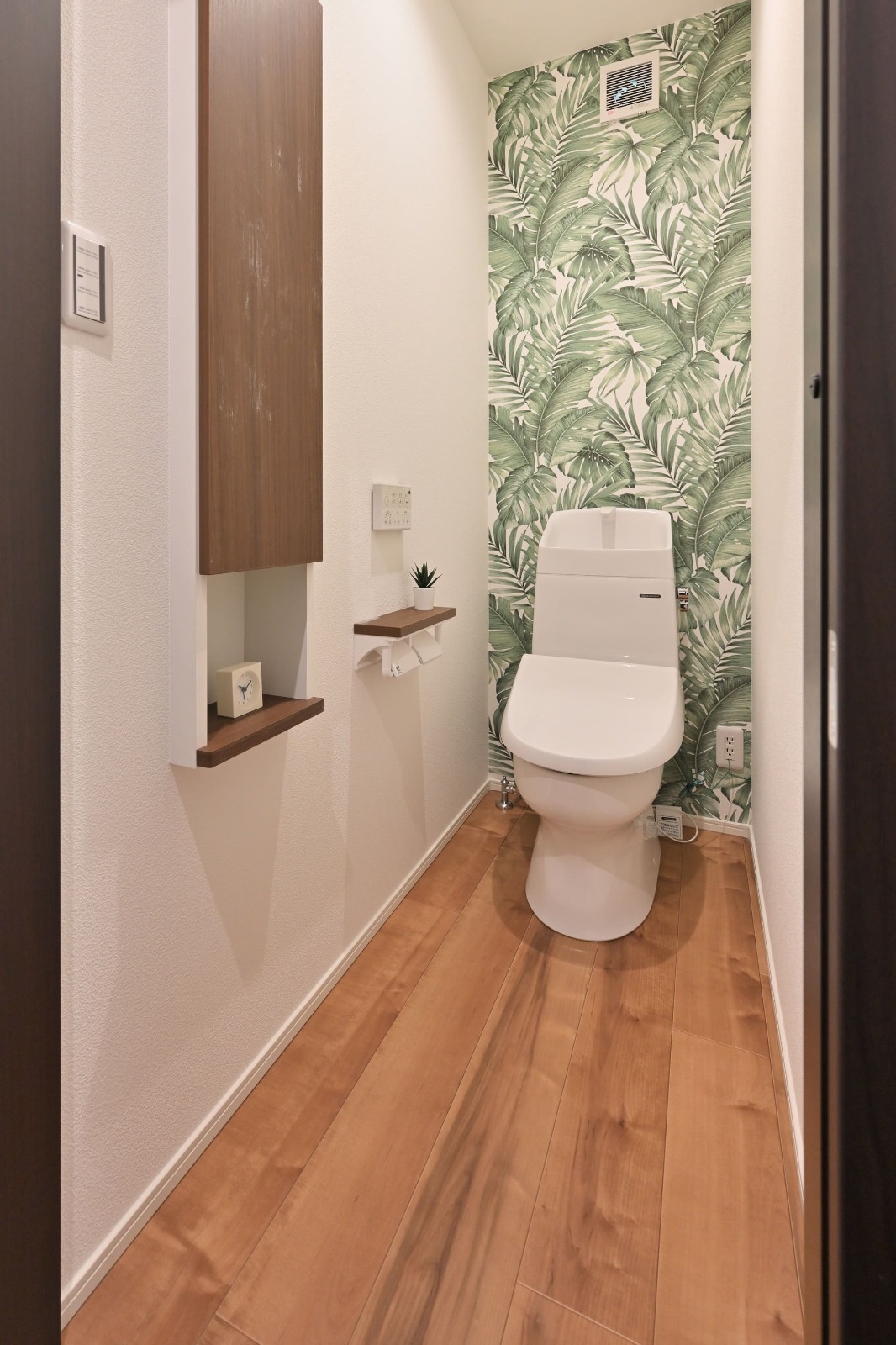 ボタニカル柄のアクセントクロスが目を惹くトイレ。