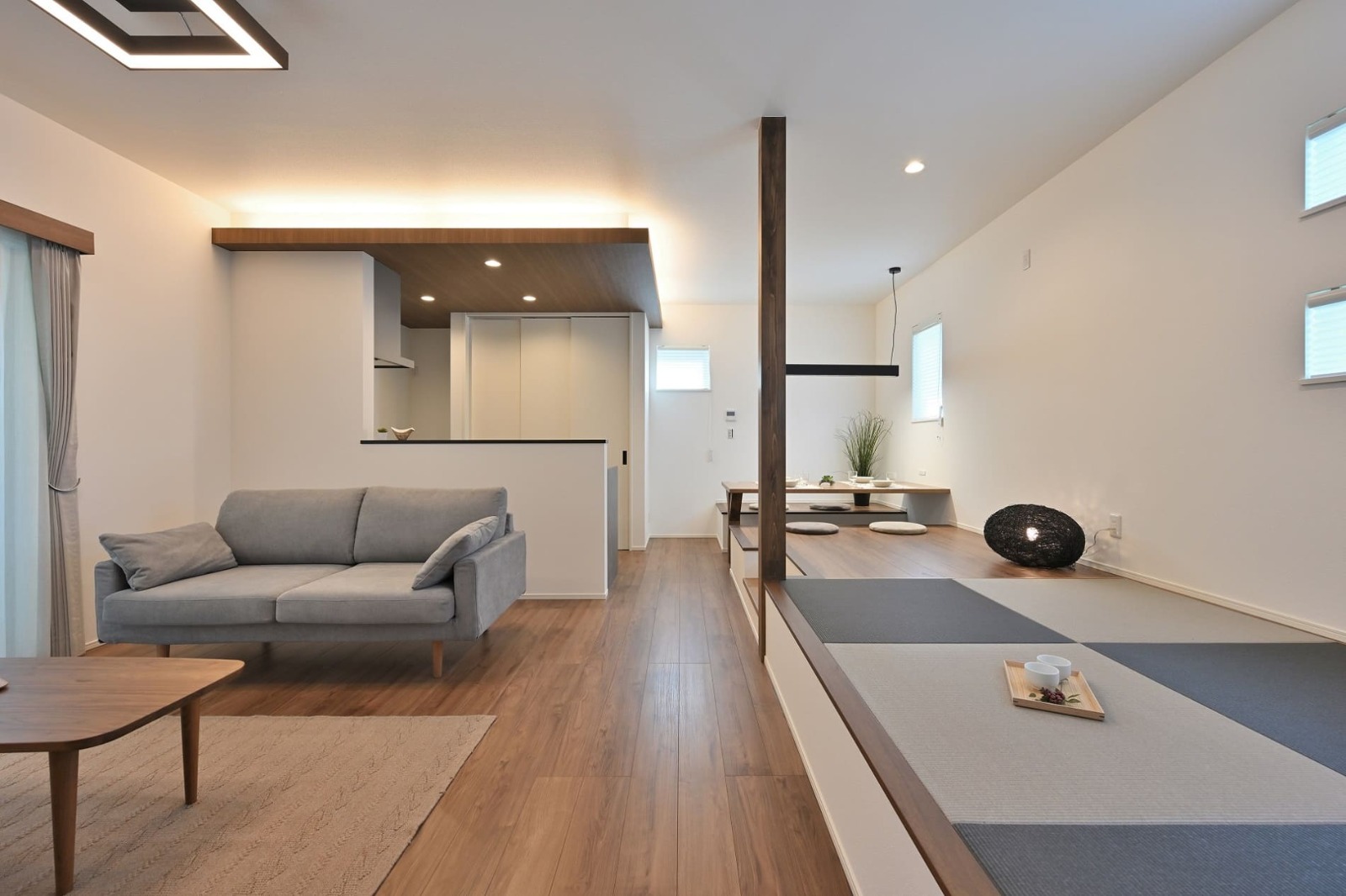 21帖のLDK。リビングエリアと、小上がりのダイニング、畳スペースの和モダンエリアでゾーニング。造作のダイニングテーブルや、キッチン上の間接照明で、より雰囲気のある空間に。