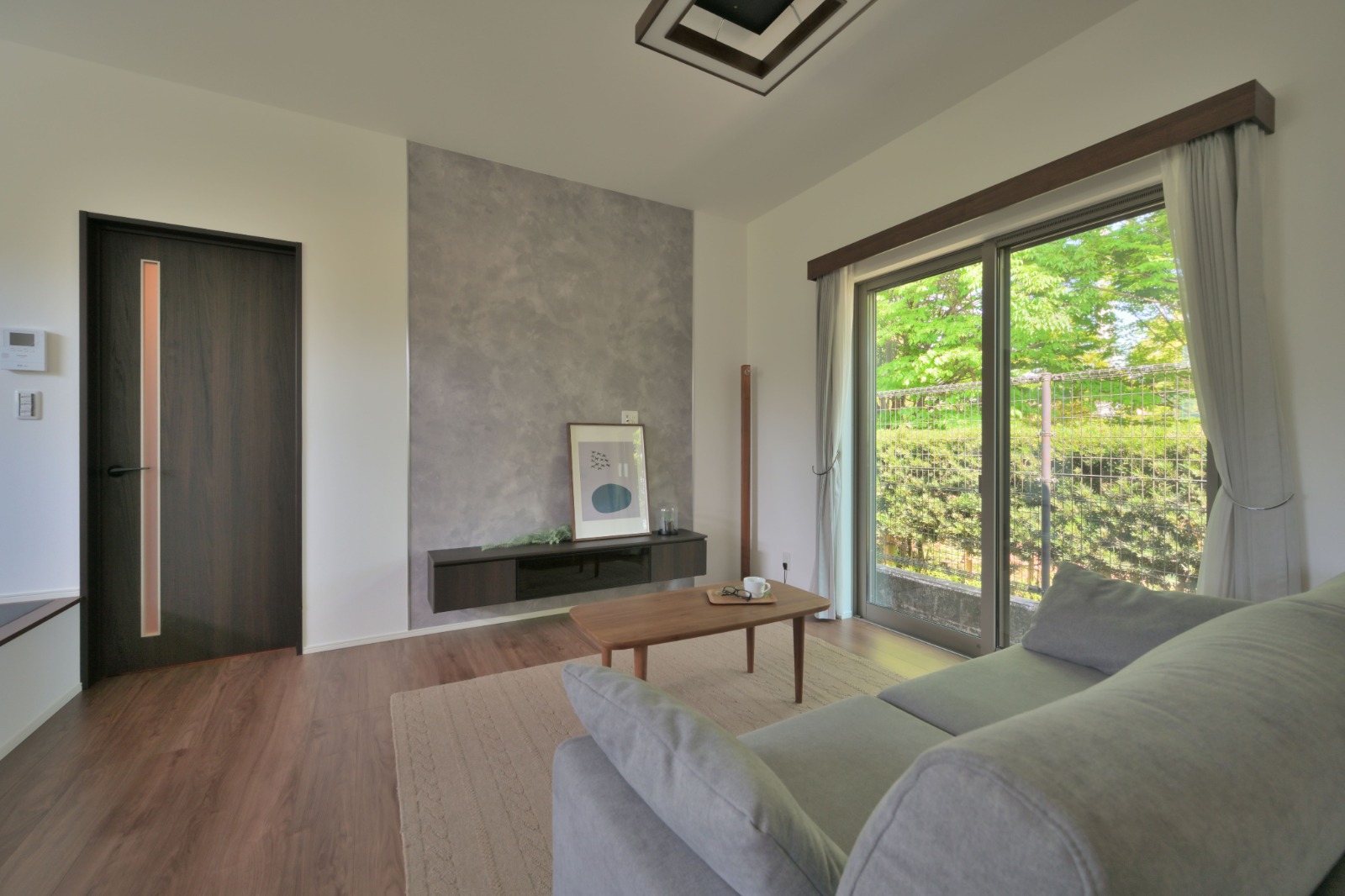リビングのテレビボードの背面には石調のアクセントクロス。テレビボードも浮かせる仕様でスッキリと綺麗に。緑地帯の借景で緑を取り込めるのも素敵です。