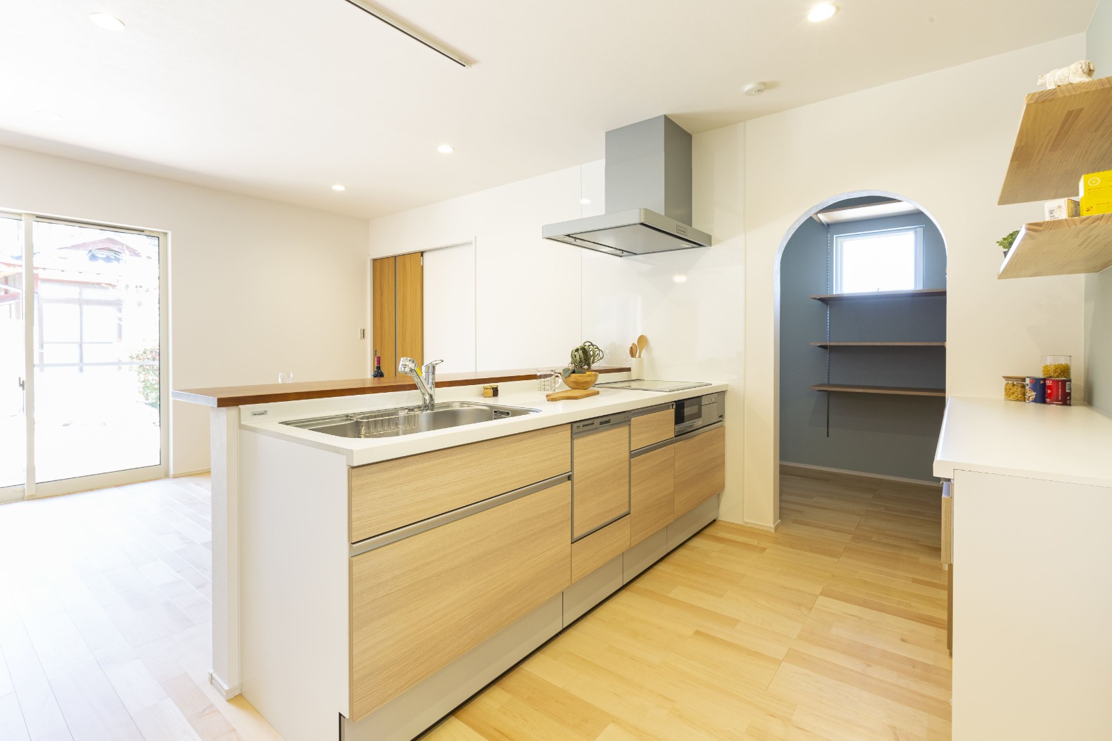 買い物した荷物を玄関からスムーズにパントリーへ。入り口はアーチ状に。