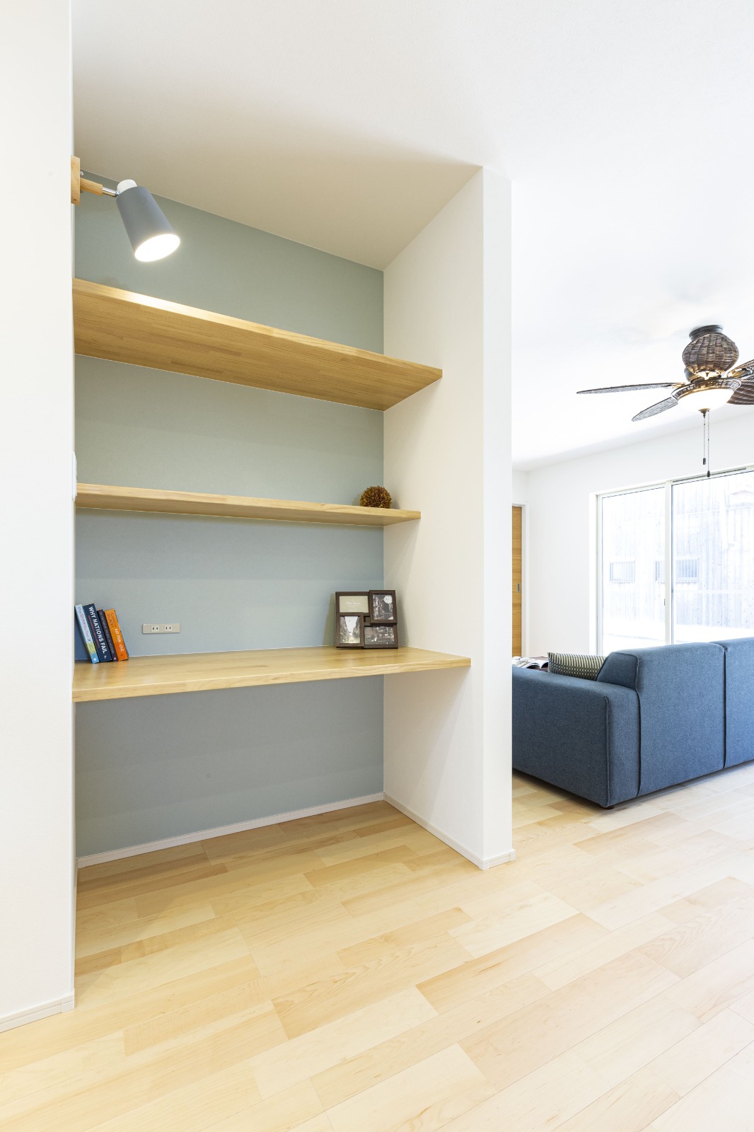 リビングにあるスタディーコーナー。キッチンや洗面脱衣室との動線も良好なので家事コーナーとしても使える。