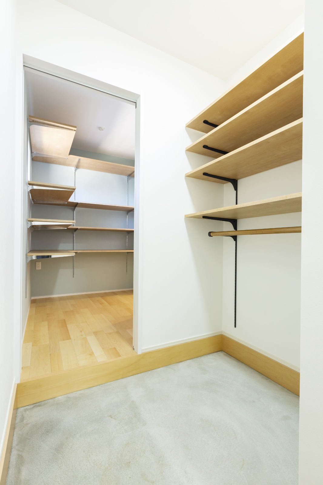 玄関は2WAYで、収納もたっぷり。アウトドア用品も片づけられる土間も使いやすい。玄関→パントリー→キッチンに繋がっているので、買い物帰り楽々♪