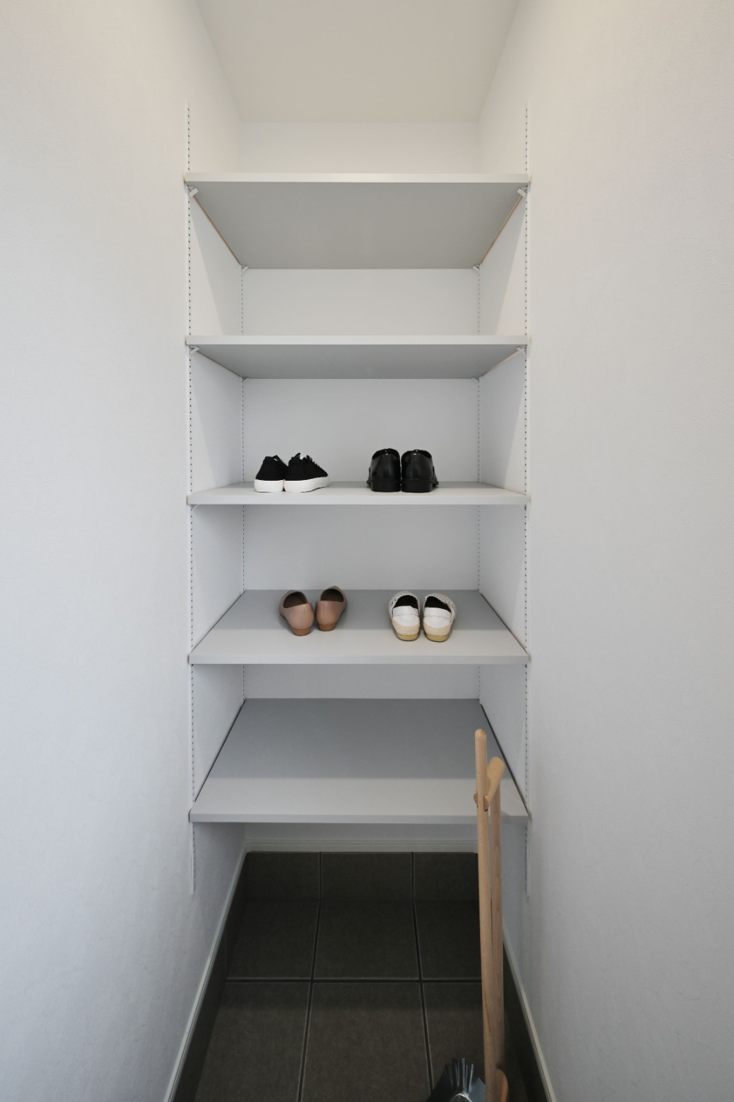 玄関横にはシューズクロークを設置。可動棚で好きな高さに調整することができます。