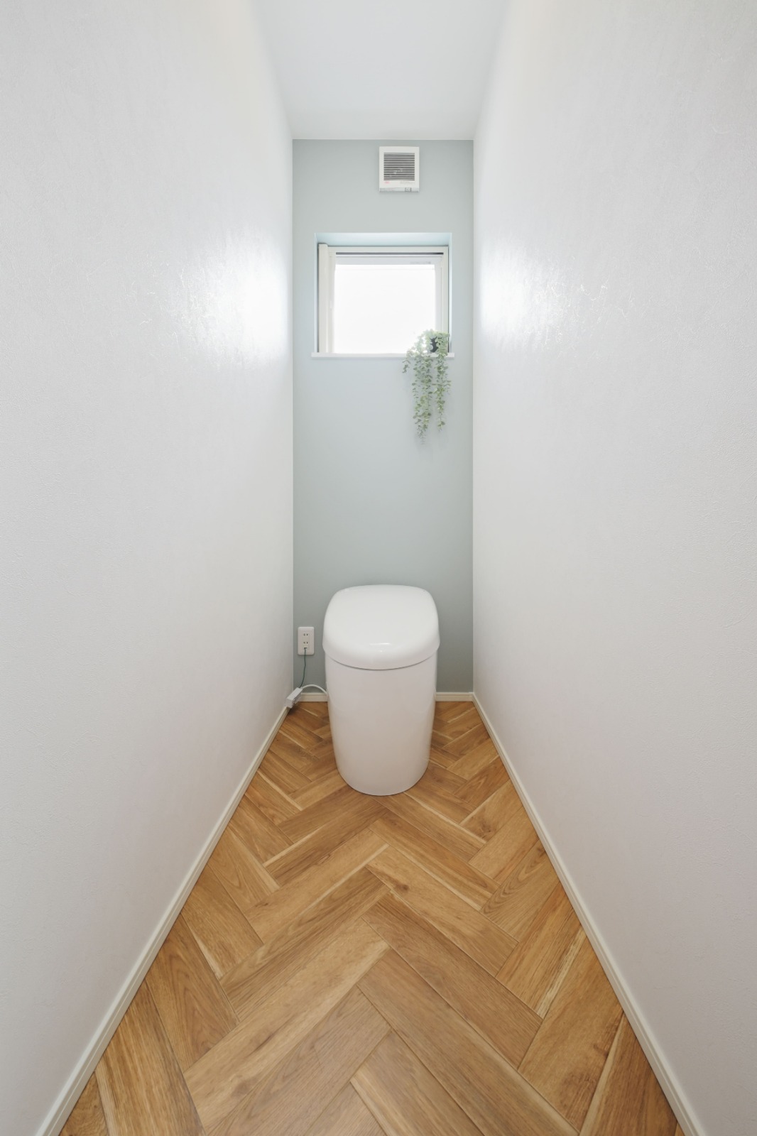 タンクレストイレを採用されました。水色のアクセントクロスでさわやかな印象に。