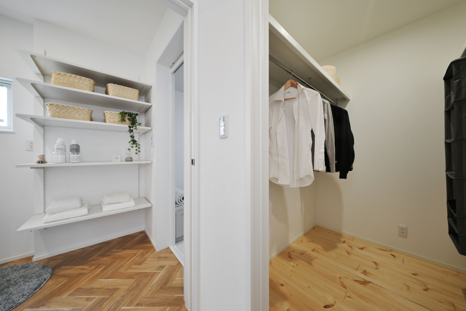 洗面所の隣にはウォークインクローゼットを配置。洗面所で干した洗濯物を隣のウォークインクローゼットにすぐ収納できます。ご家族のお洋服を収納できるので、2階にお洋服を取りに行く手間が省けて時短に◎