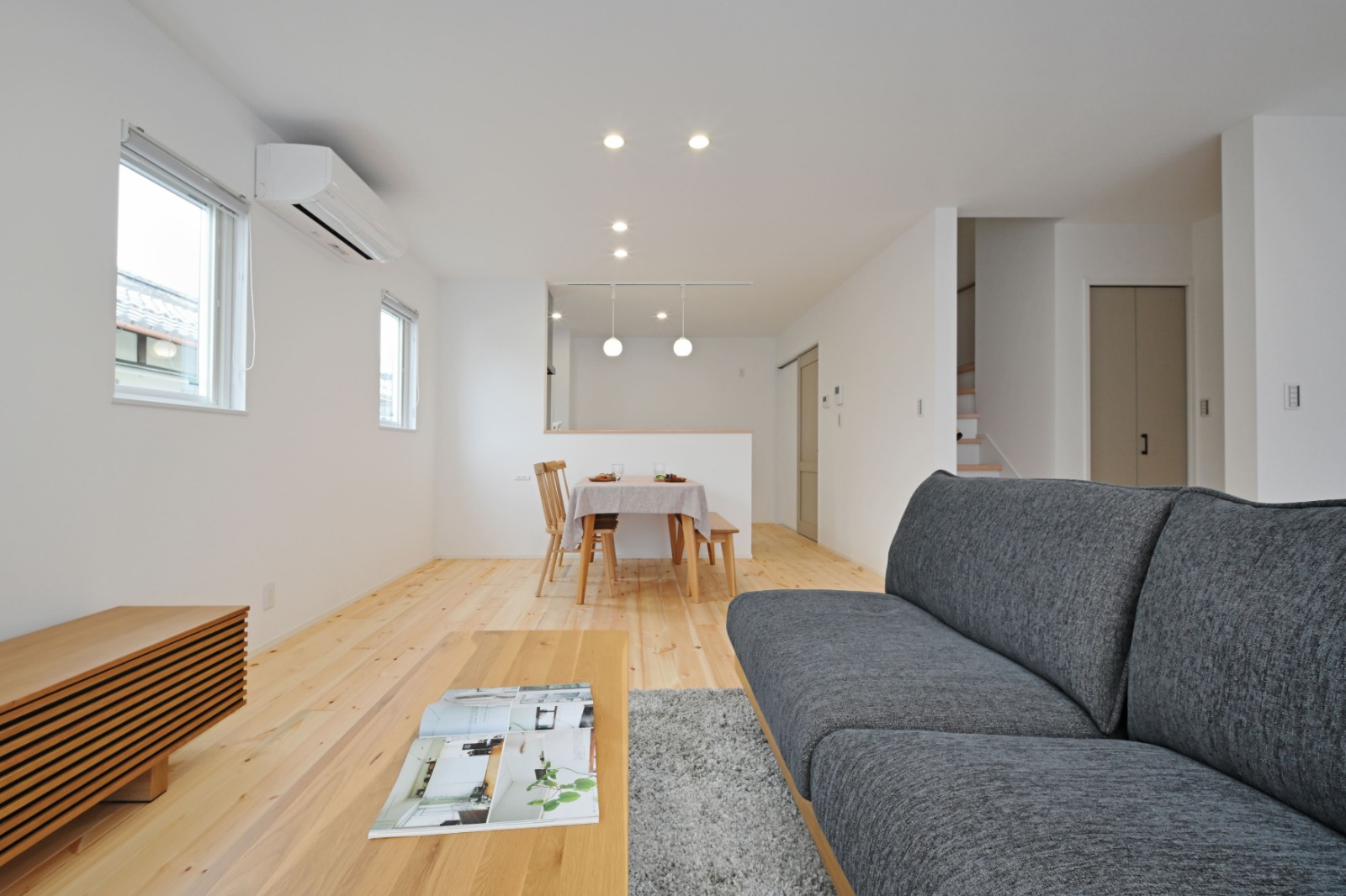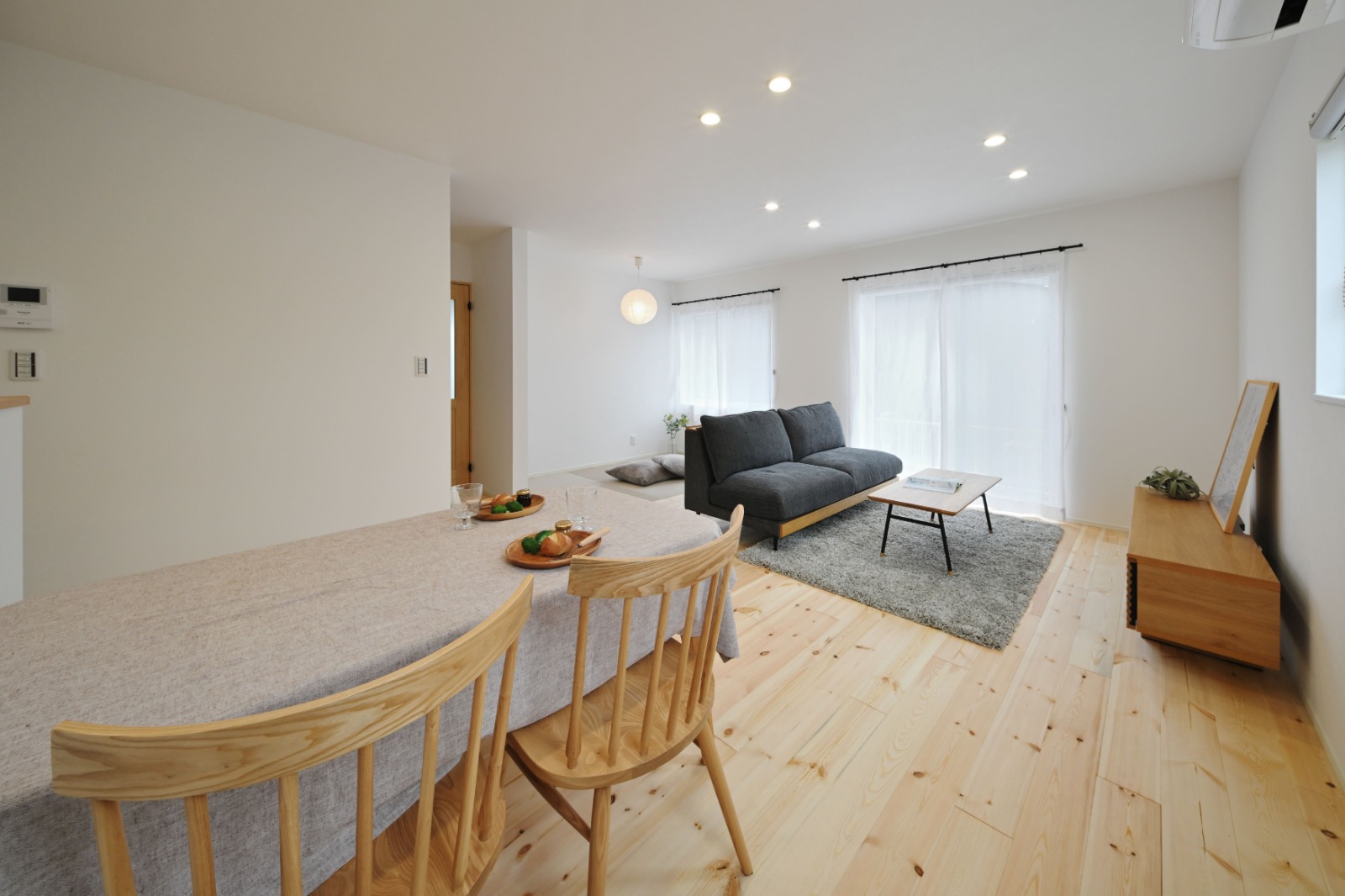 無垢床のパイン材を使用したあたたかみのある空間に、リビングと繋がる和室を設けたナチュラルテイストのお家。