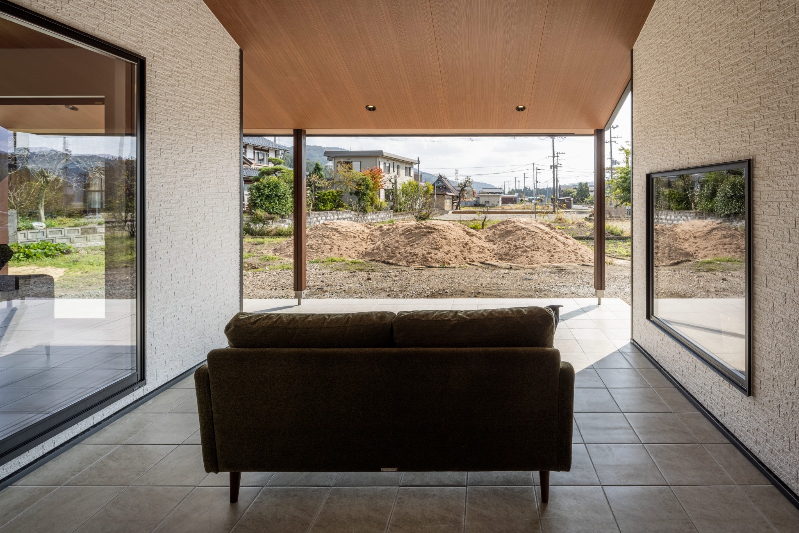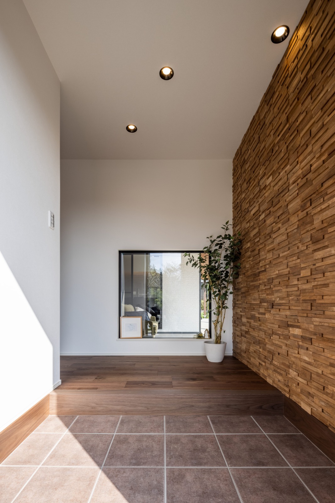 玄関ホールは木のモザイクタイル貼り。頭上の間接照明に照らされて、凹凸が陰影を生む。正面の大きな地窓の向こうには、インナーテラスが見える。