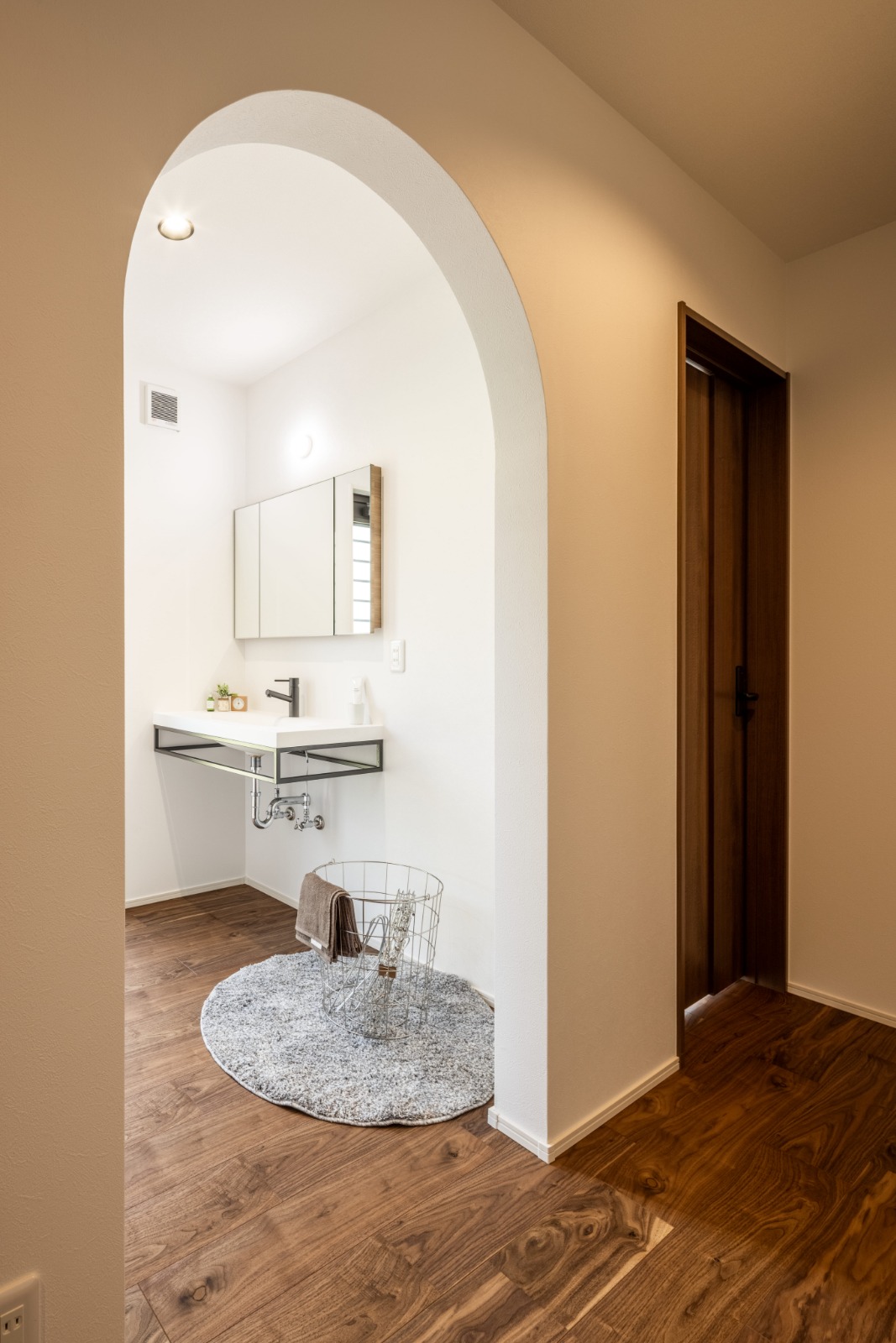 アールの入り口をくぐると、シンプルでお手入れしやすい洗面室。「細部までこだわったけど、カステルホームさんが的確に応えてくれました」