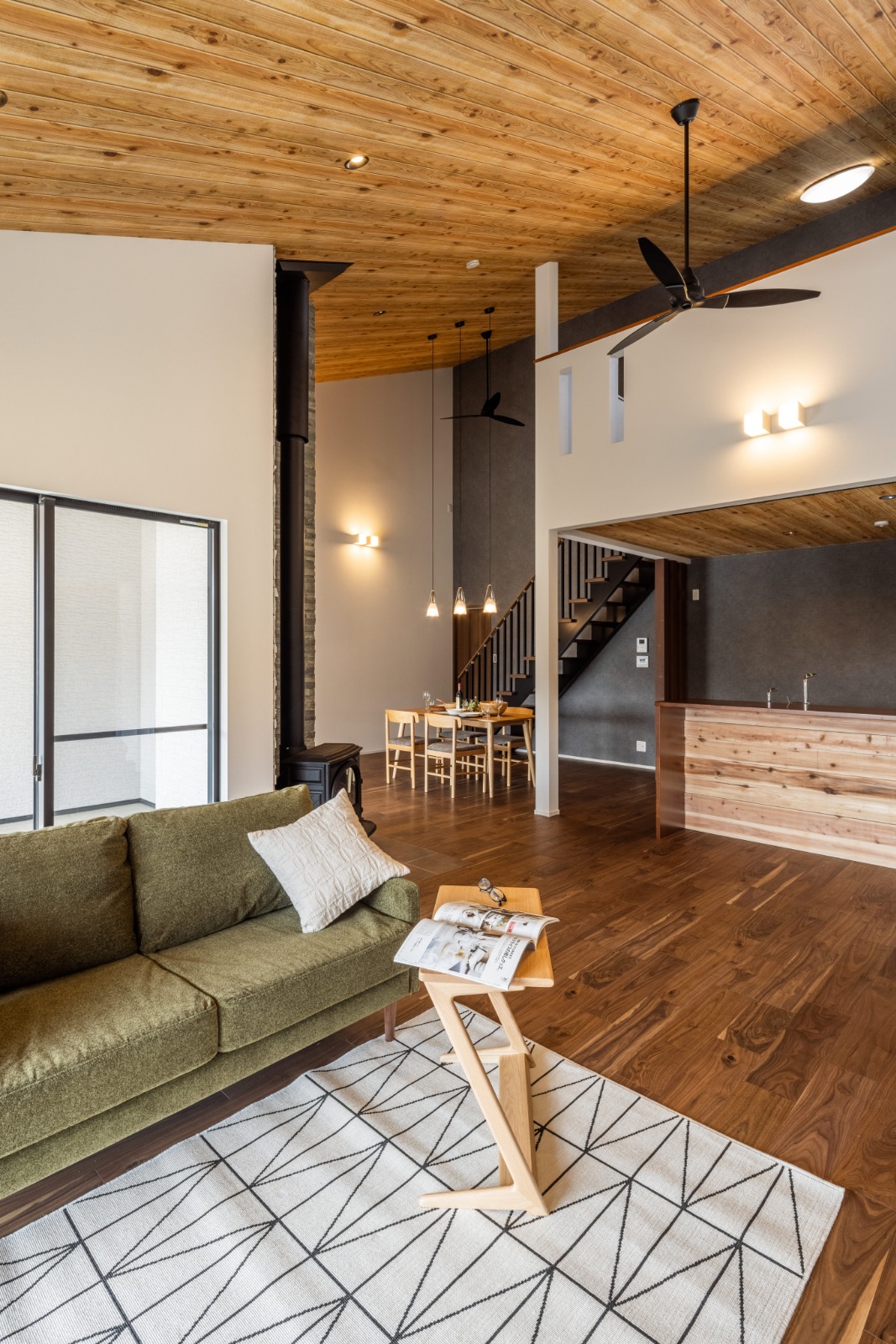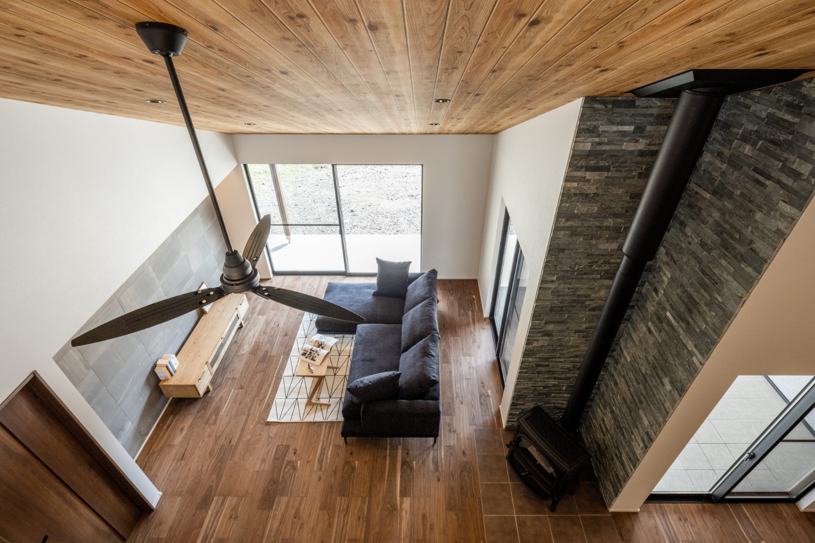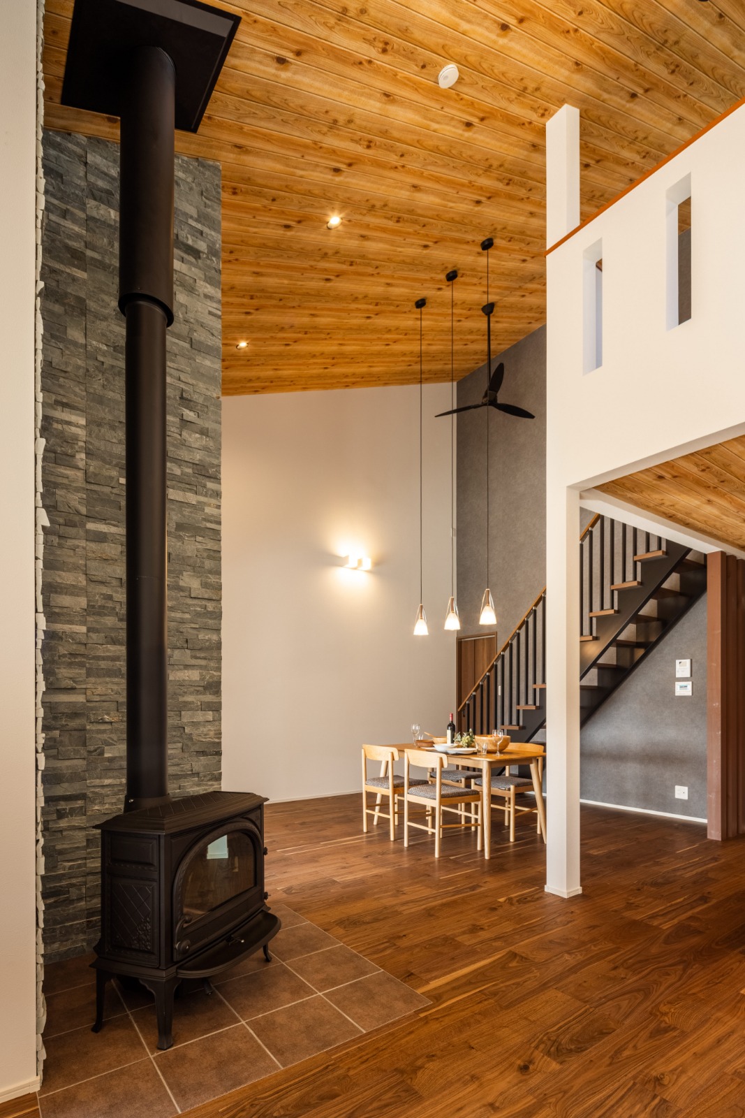 絶対にほしかったという暖炉は、家のどこにいても目に入る位置に。石タイルが天井まで貼られ、重厚感を添えている。「間仕切りの少ない家だけど、家がまるごと、すぐ暖まるんです」