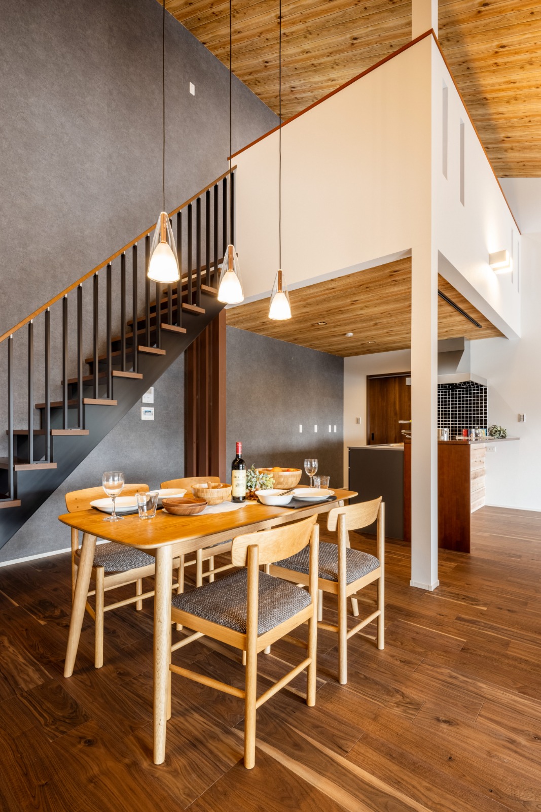 木目の天井とダイニングインテリアの色味の統一感がおしゃれ。