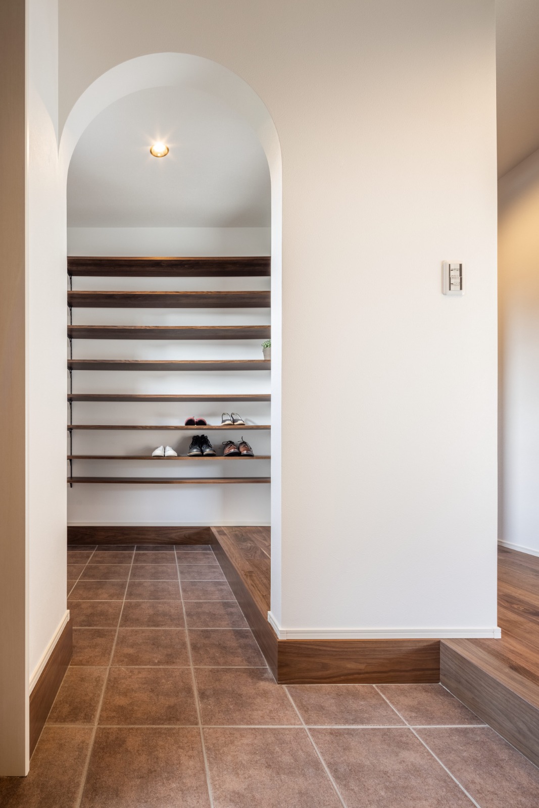 アールに切り取られたおしゃれなシューズインクローゼット。2wayでどちらからも出入り可能。