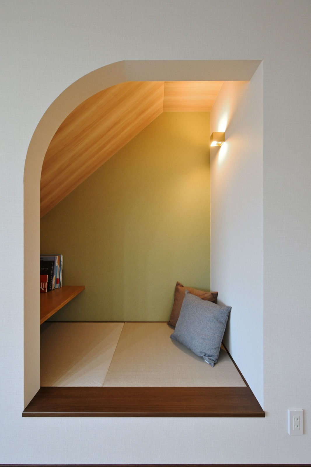 階段下を利用して和風ヌックに。隠れ家のようなスペースで、家族の気配を感じながらひとり時間を楽しめます。