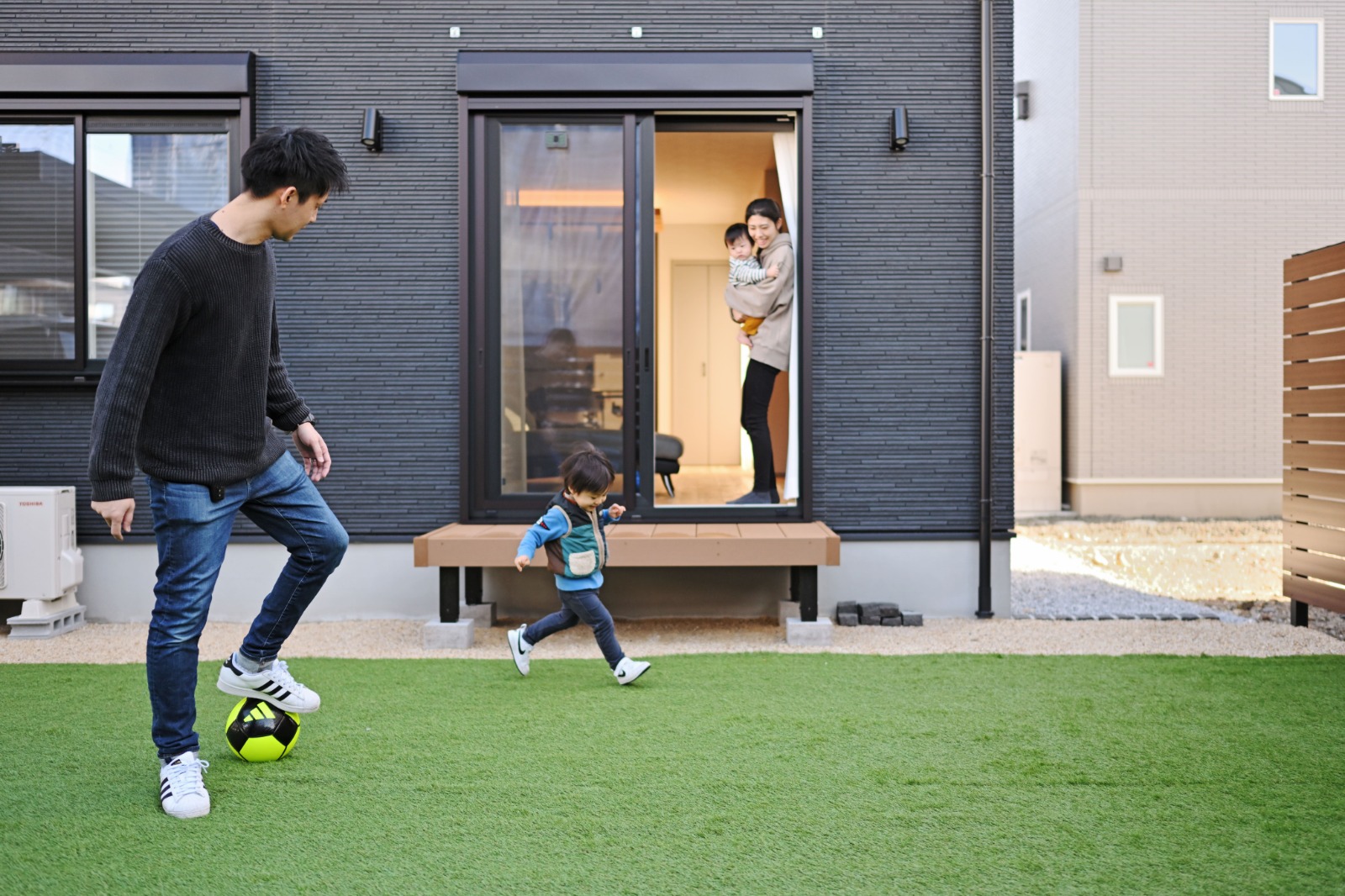 大きな人工芝のお庭でボール遊びなどをすることができます。キッチン横の掃き出し窓からも出入りできます。
