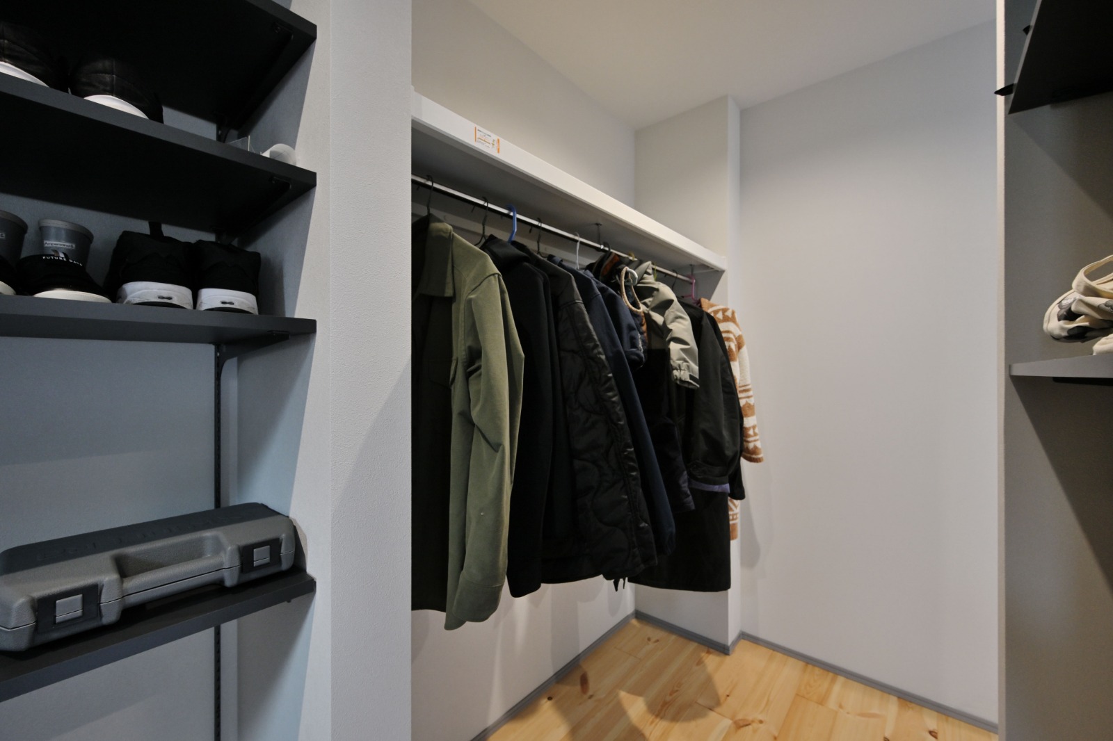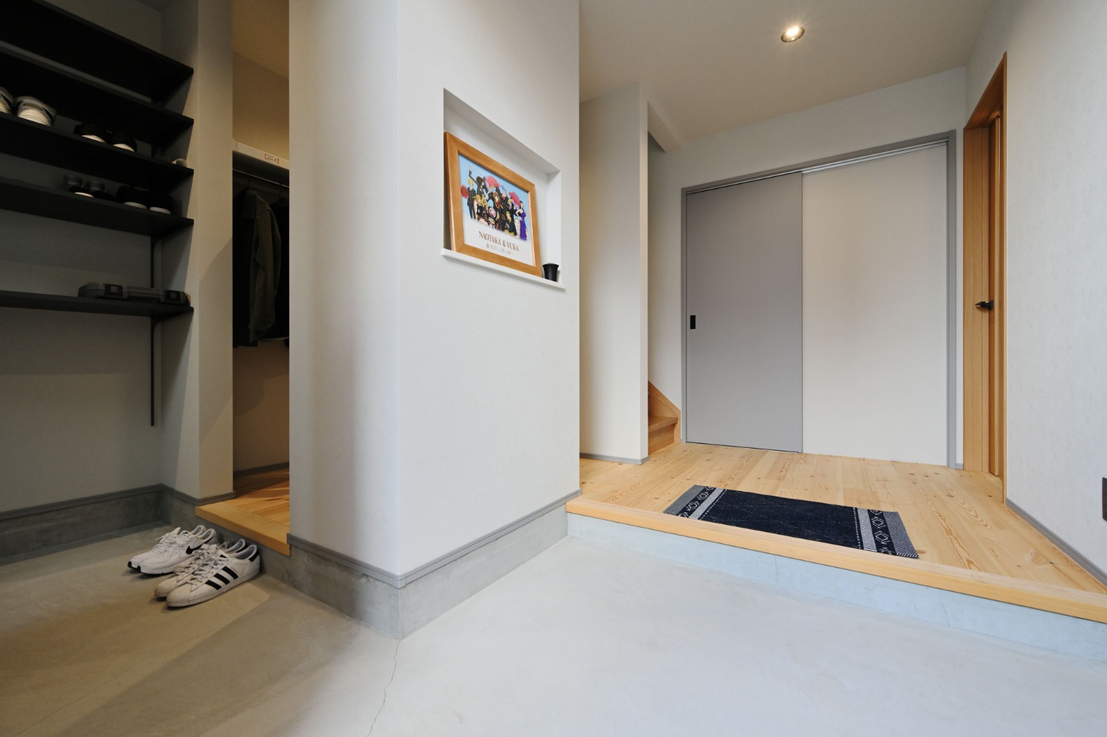 玄関はモルタル仕上げでスタイリッシュな印象に。シューズクロークは広めに採用され、Kさんの趣味のキャンプ用品なども収納できるようにしました。玄関は来客用と家族用の2wayにされました。