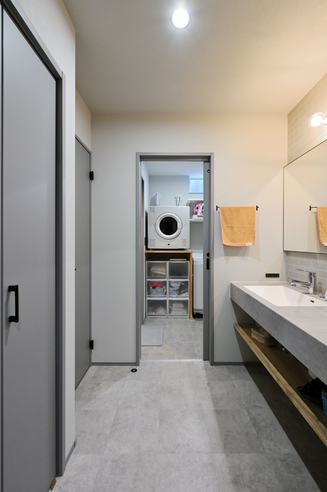 玄関→洗面所→脱衣所→キッチンに繫がる回遊動線。脱衣所には乾太くんを採用。乾太くんに合わせて収納棚を造作で作りました。
