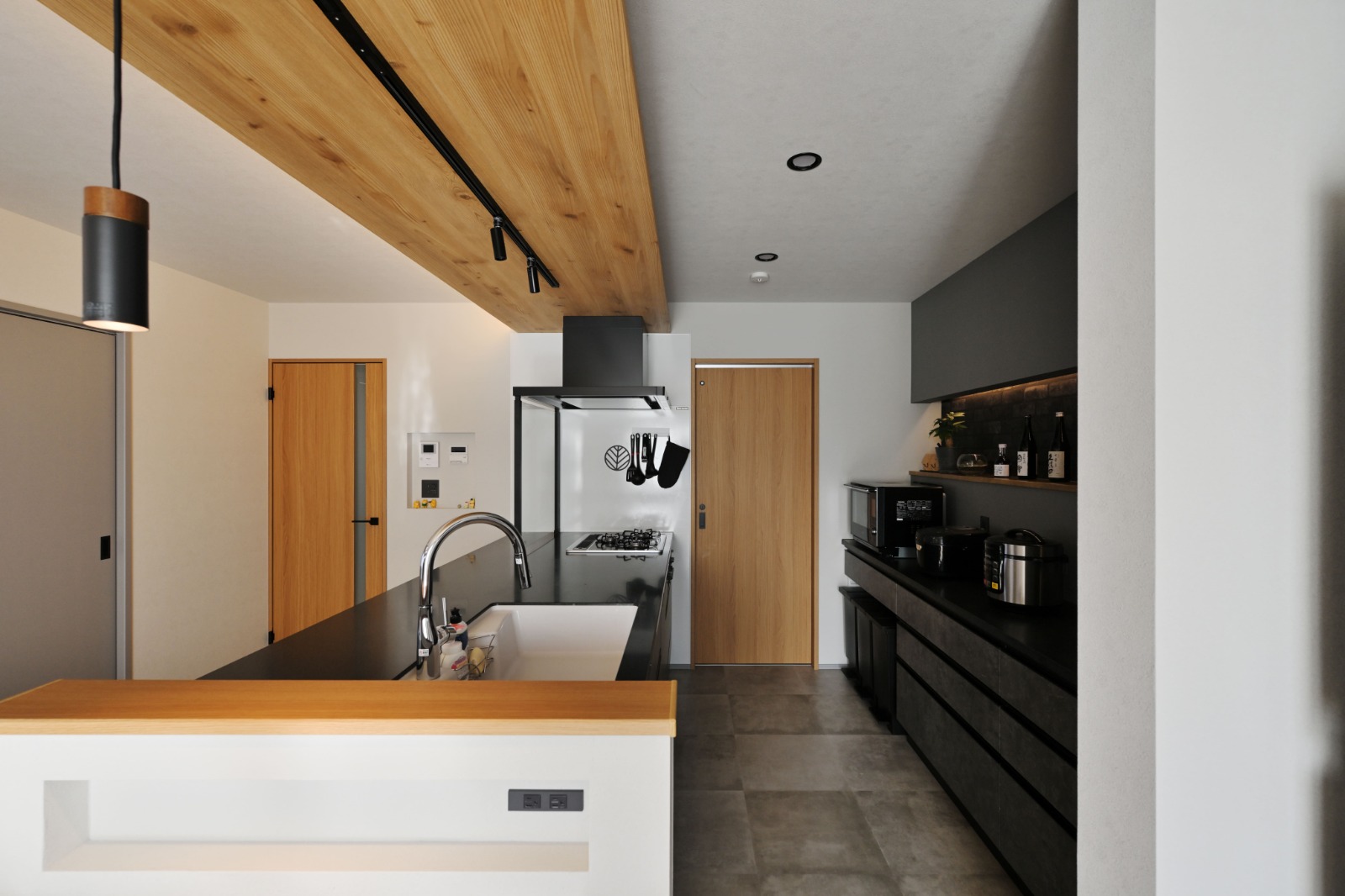 毎日の暮らしやすさを考え、家の中をスムーズに移動できる回遊動線を採用。無駄な動きを減らし、どこにいても快適に過ごせるよう工夫されている。キッチン周りは広く確保し、料理のしやすさはもちろん、家族が自然に集まれる空間に。またKさんのお気に入りのお酒を飾れるニッチを設け、インテリアの一部として楽しめるように。デザインと色合いをこだわられたKさん。グレーを基調とした統一感のある落ち着いた雰囲気に仕上げている。シンプルながらも洗練された印象を与え、どの空間にいても心地よく感じられるよう配慮している。床は無垢のパイン材を採用。大きな掃き出し窓からたっぷり光が差し込み、より一層温かみを感じられる空間となっている。家全体の環境にも配慮し、どこにいても気温差を感じにくい快適な空間を実現。