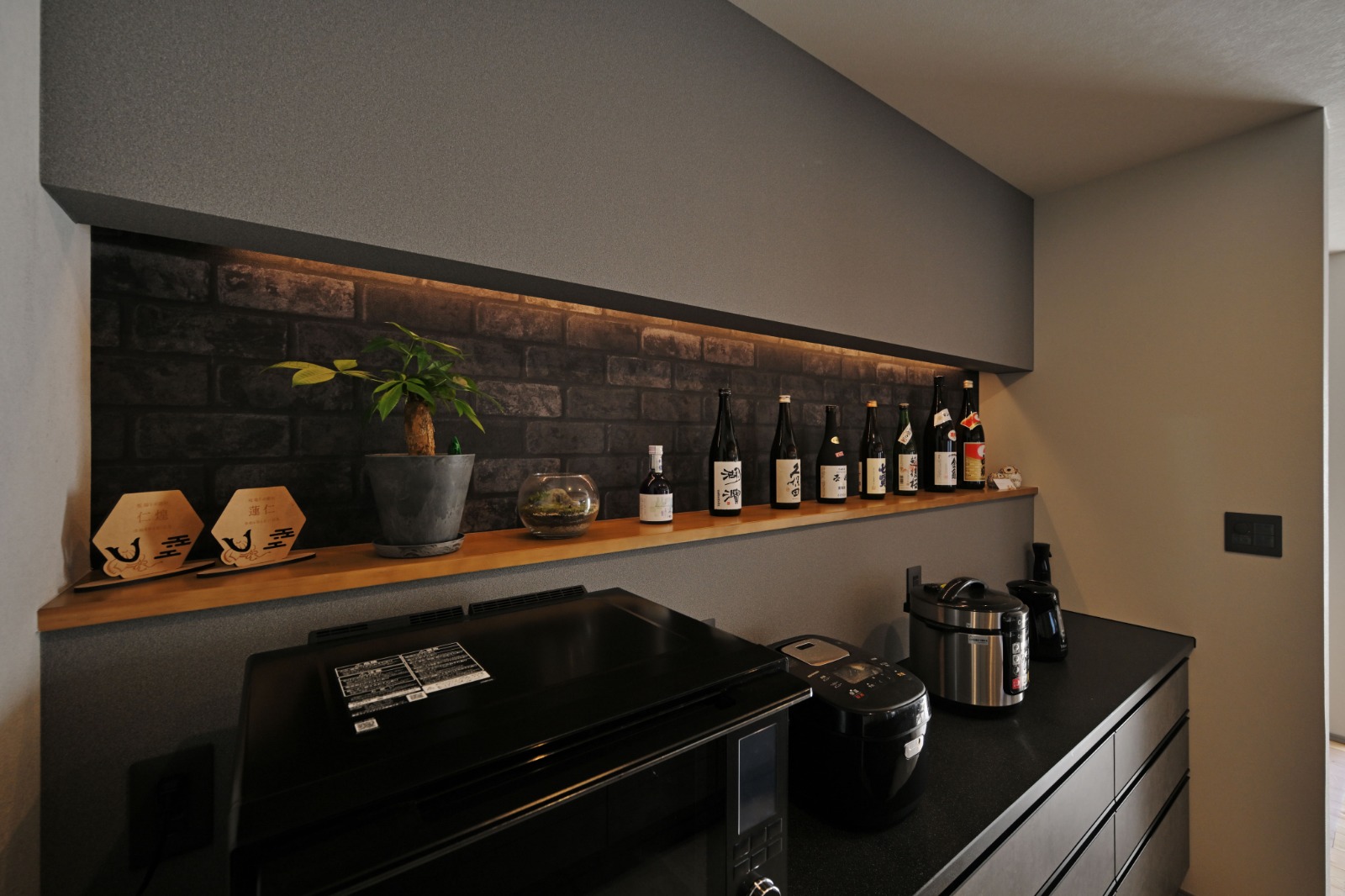 キッチンの背面にはお酒をディスプレイできる飾れるニッチを採用されました。間接照明でよりおしゃれな印象に。