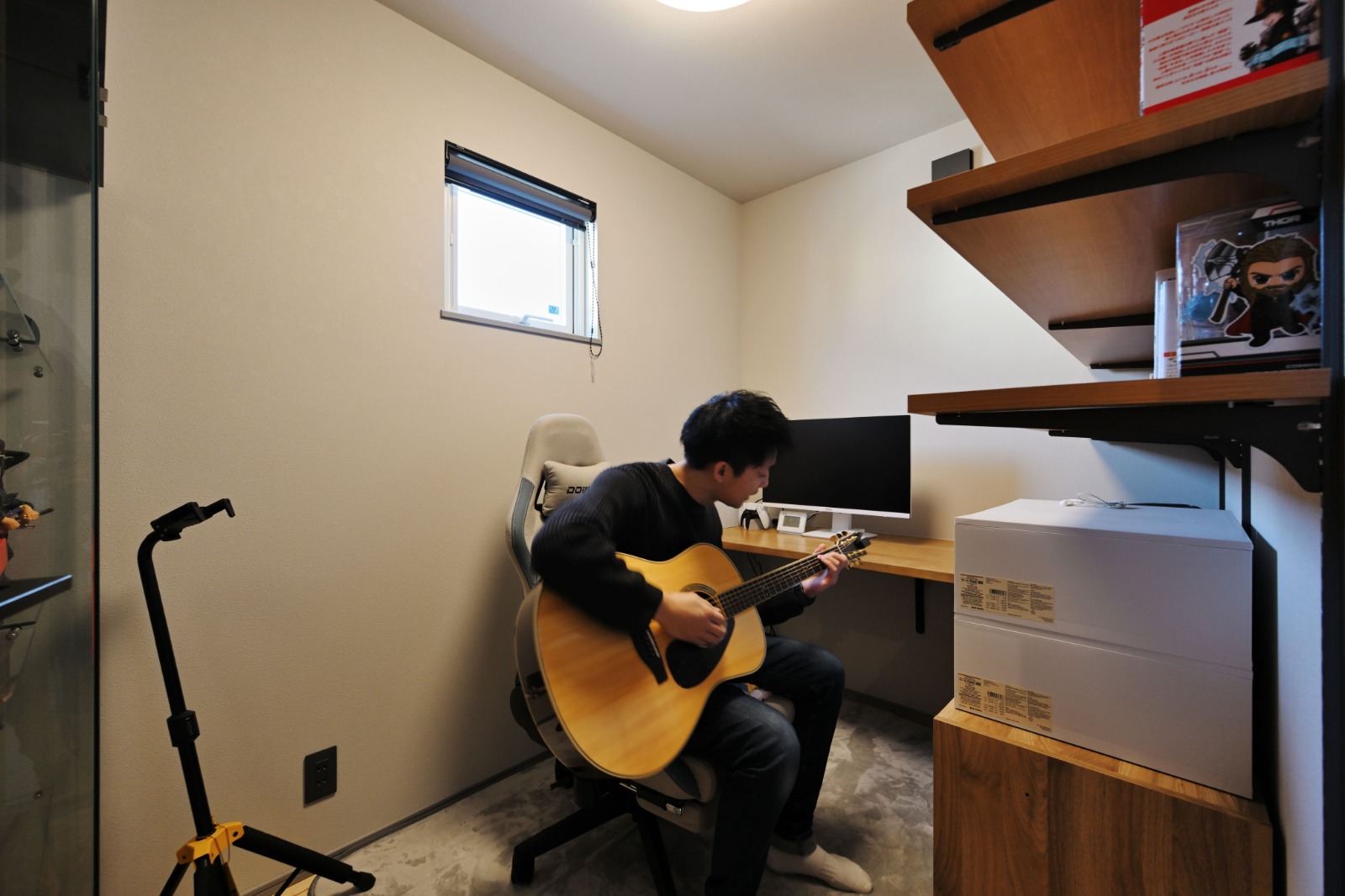3帖の書斎。在宅ワークをしたり趣味のギターを楽しまれているKさん。可動棚を設け、お気に入りのフィギュアを飾られています。