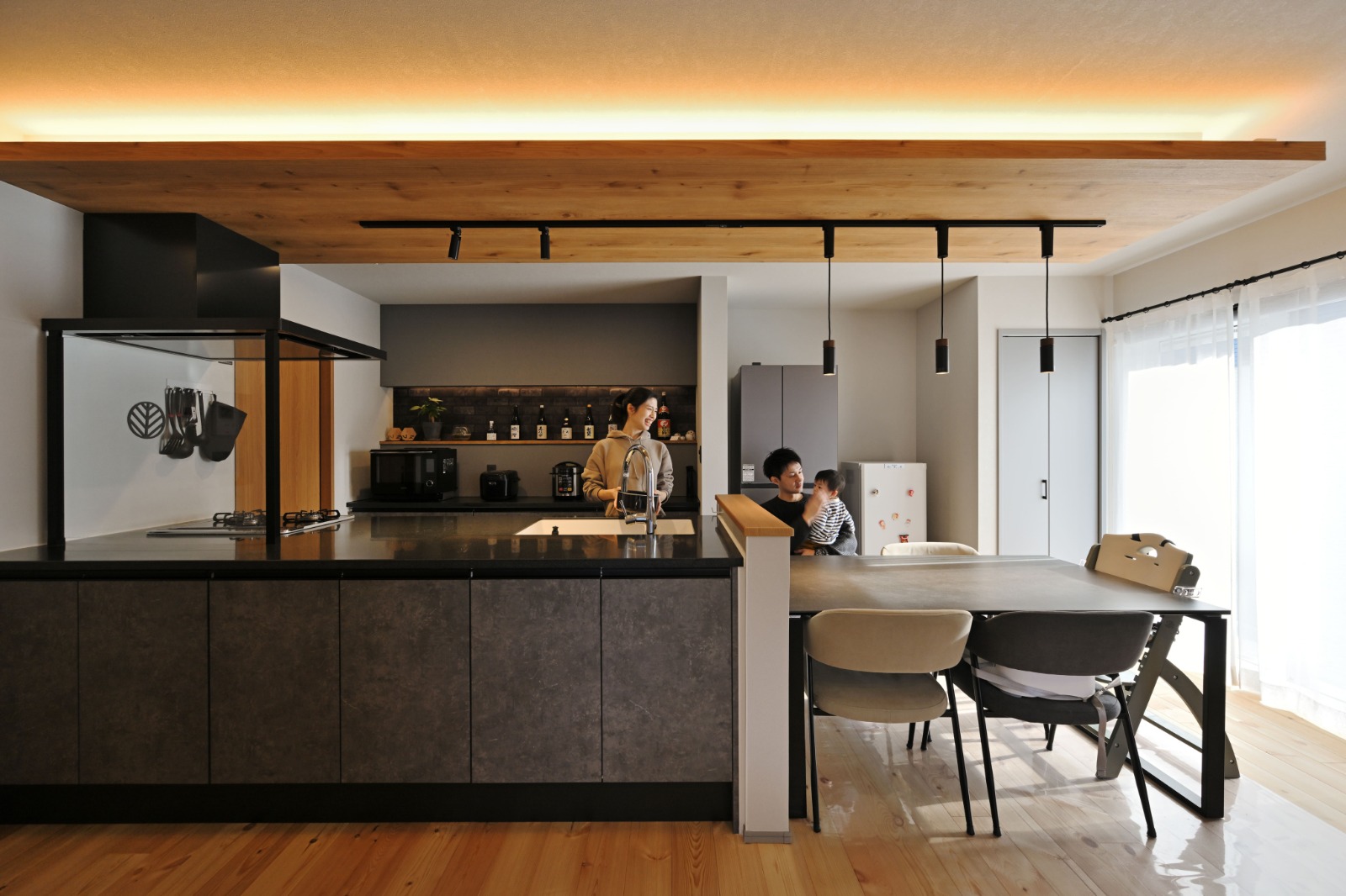 キッチンは下がり天井に間接照明でよりおしゃれに。