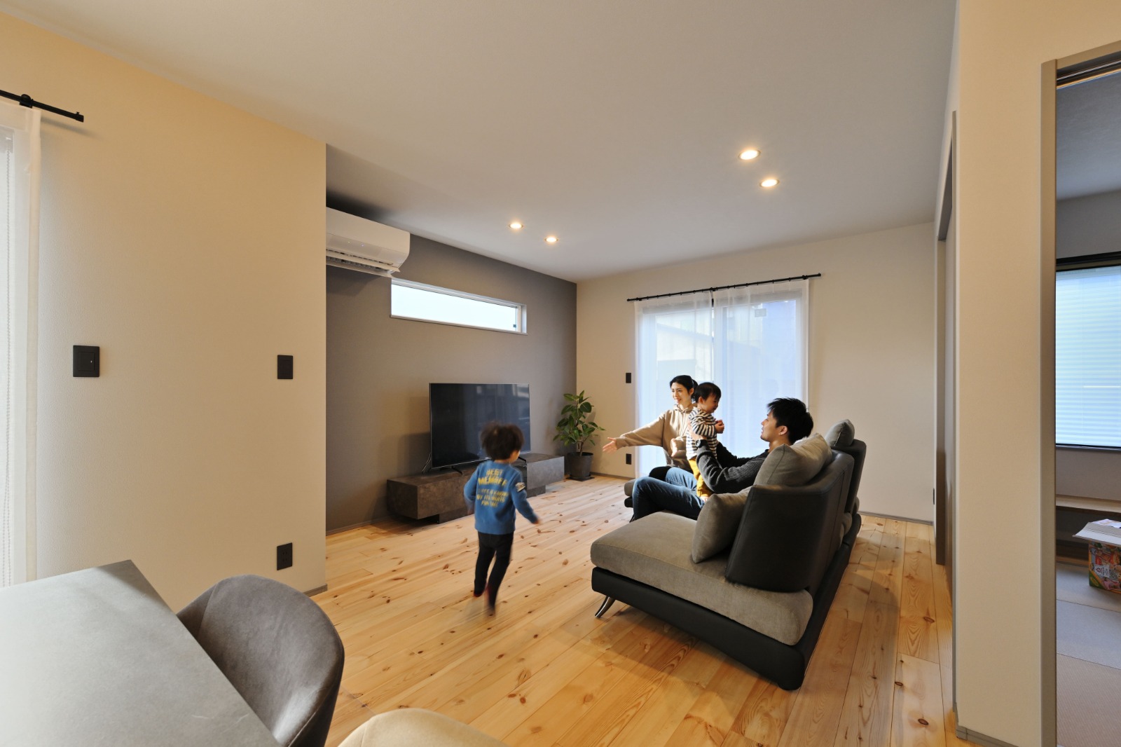 21帖の広々リビング。建具や家具の色をグレーで統一されました。床は無垢のパイン材を採用。木の温もりを感じられます。