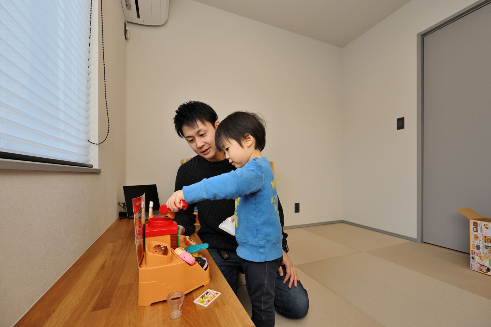 琉球畳を採用されました。造作カウンターは将来お子様が勉強できるように設けられました。カウンター下にはランドセルなども収納できます。