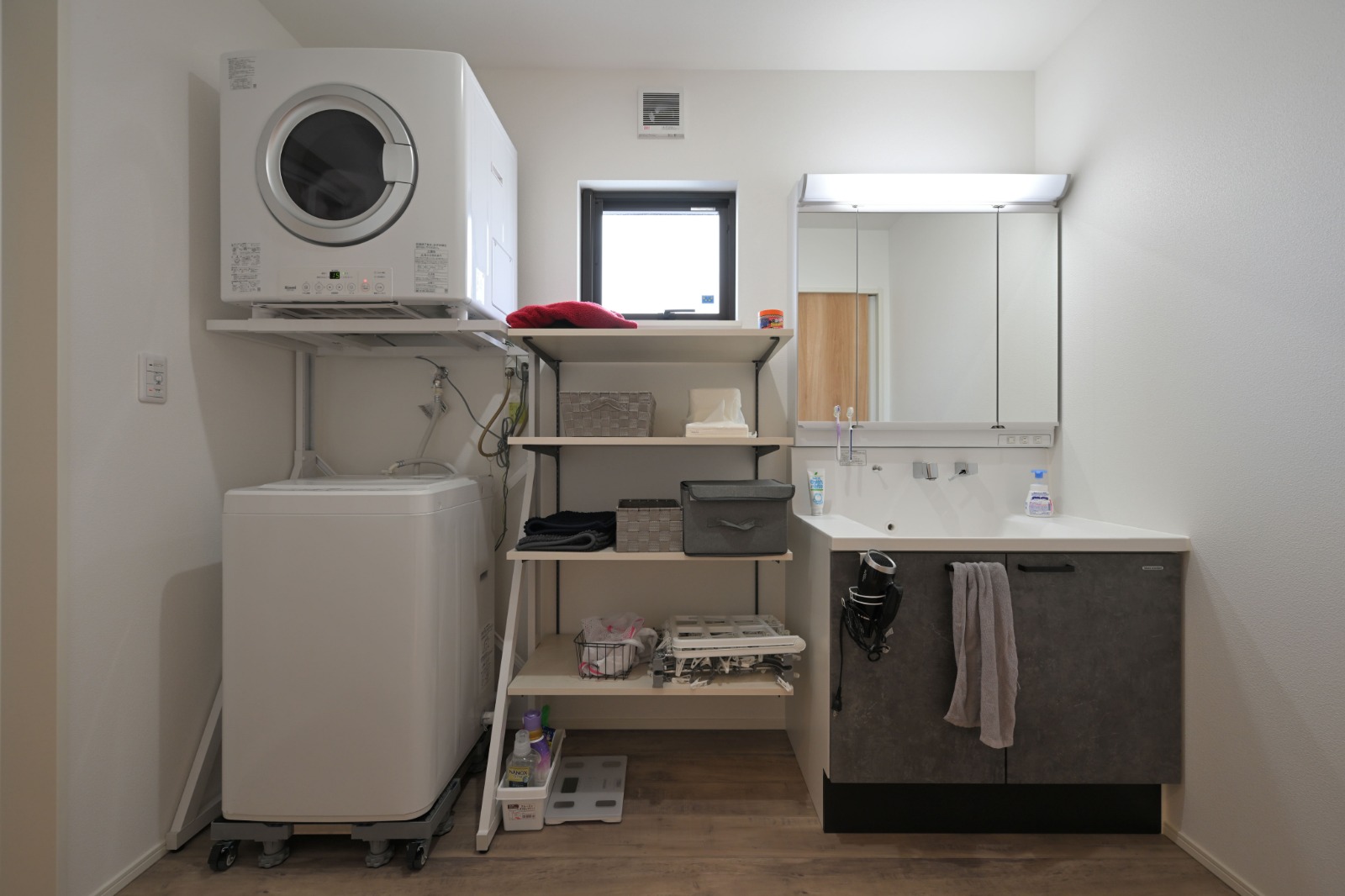 乾太くんを採用されました。洗濯機から乾太くんにいれるだけで洗濯物が終わるので毎日時短とのこと。真ん中には可動棚を設け、パジャマや洗剤を置けるスペースに。