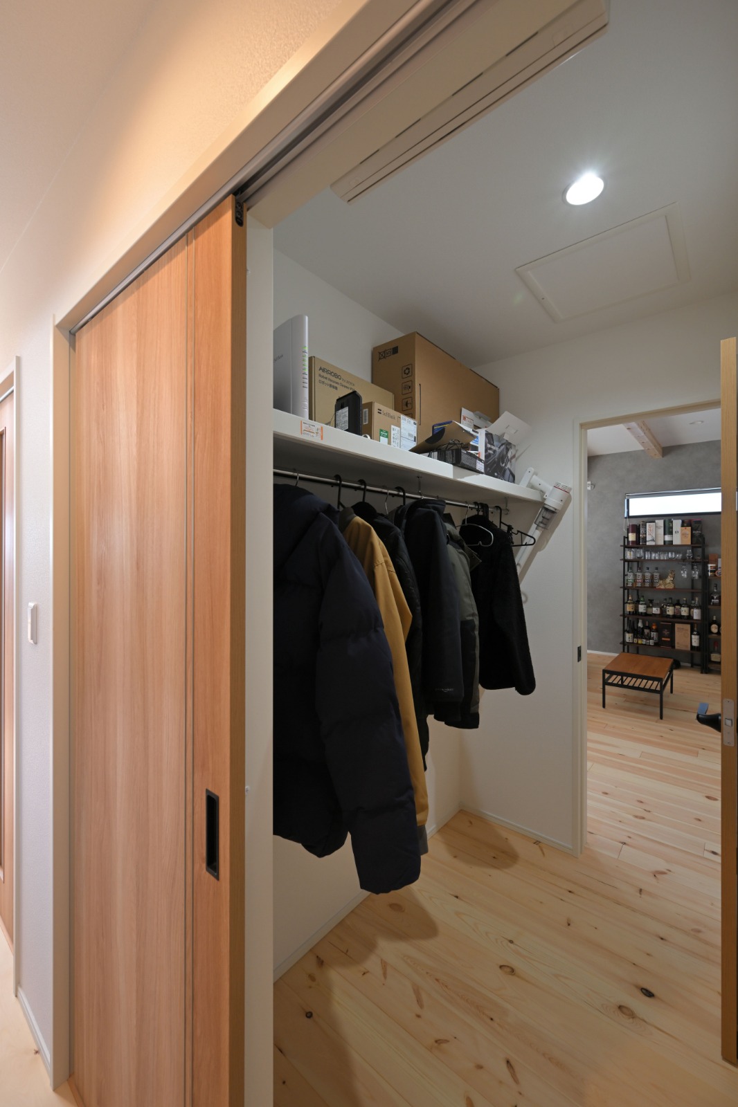 ウォークスルーできるウォークインクローゼット。リビングから洗面所、トイレにすぐ行くことができます。よく使う洋服を収納するとお出かけのときに便利◎