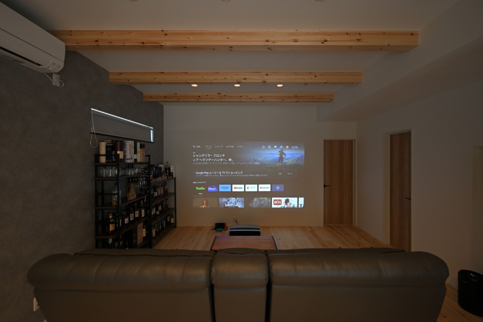 リビングにはテレビを置かずプロジェクターを採用されました。プロジェクターで映画鑑賞をしながら、お酒を飲んでいるそうです。