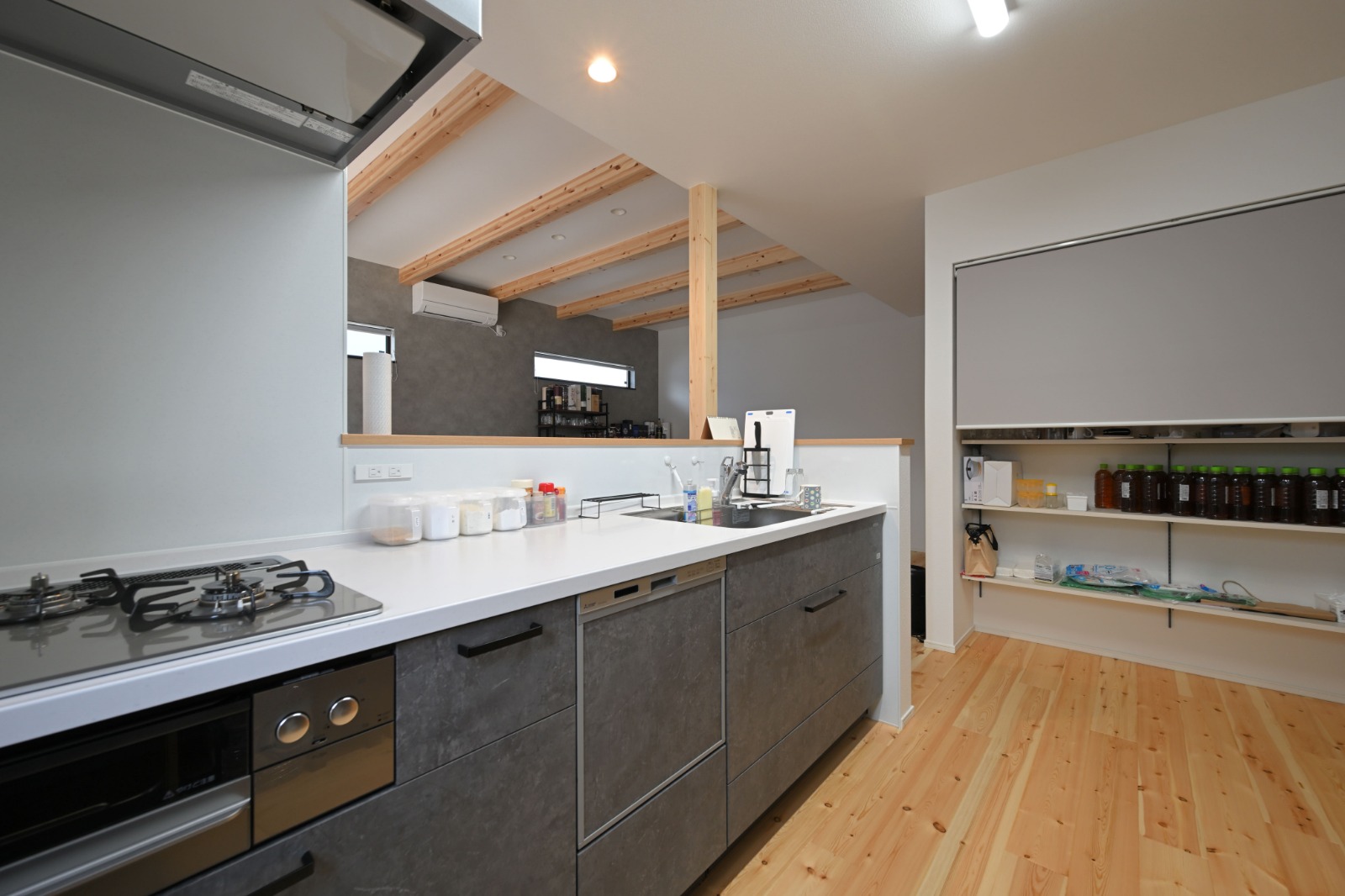 キッチン横にはパントリーを設けられました。来客時はロールスクリーンで隠すことができます。